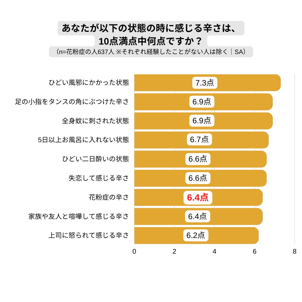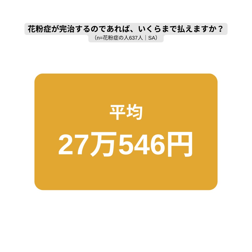 花粉症の辛さと日常生活で感じる辛さに点数を付けてもらってみたところ、「花粉症の辛さ」6.4点、「ひどい風邪にかかった状態」7.3点、「足の小指をタンスの角にぶつけた辛さ」6.9点、「家族や友人と喧嘩して感じる辛さ」6.4点、「上司に怒られて感じる辛さ」6.2点と、“花粉症は上司の叱責より辛い”ということがわかりました。また、花粉症が完治するのであればいくらまで払えるかという質問については、平均27万546円という結果に。サラリーマンの月給の手取り平均額に近い金額を支払ってでも花粉症を完治させたいという切実な想いが見えてきます。さらに、花粉症はどのくらい辛いのか、別の辛さに例えてもらったところ、「玉ねぎをずっと刻んでるくらい」「テストで0点をとったとき」「プロレスラーにビンタ」などさまざまな声が寄せられました。
