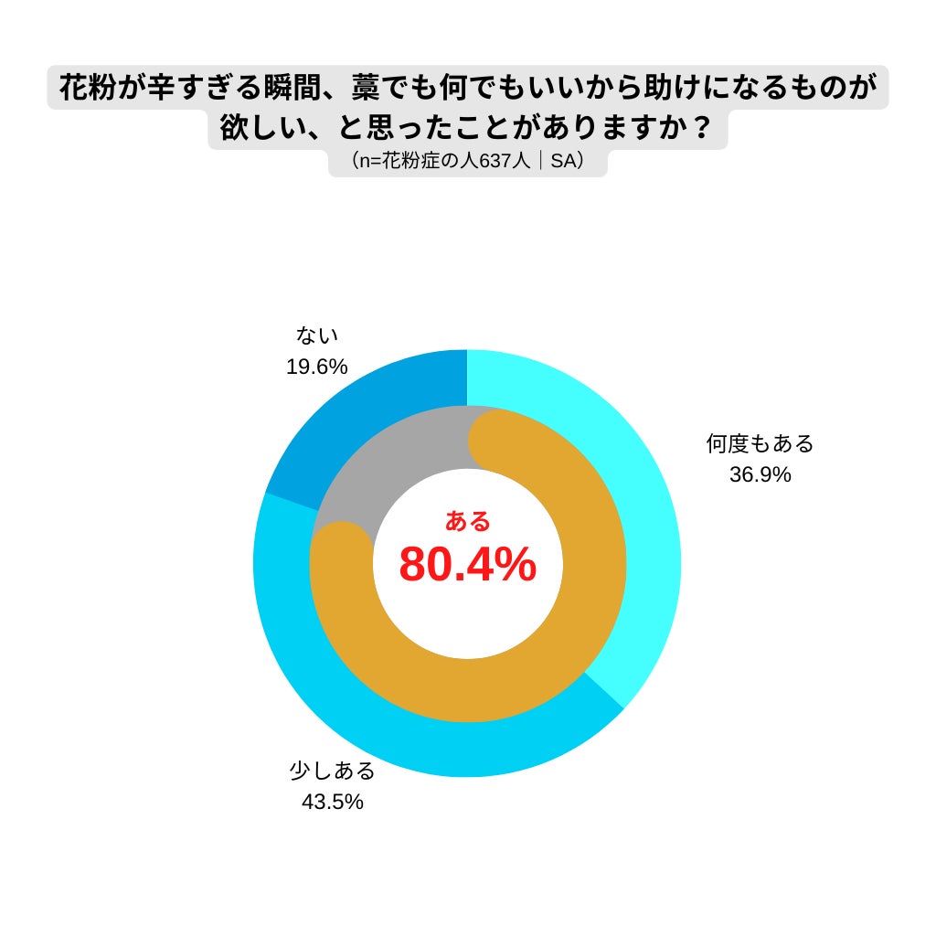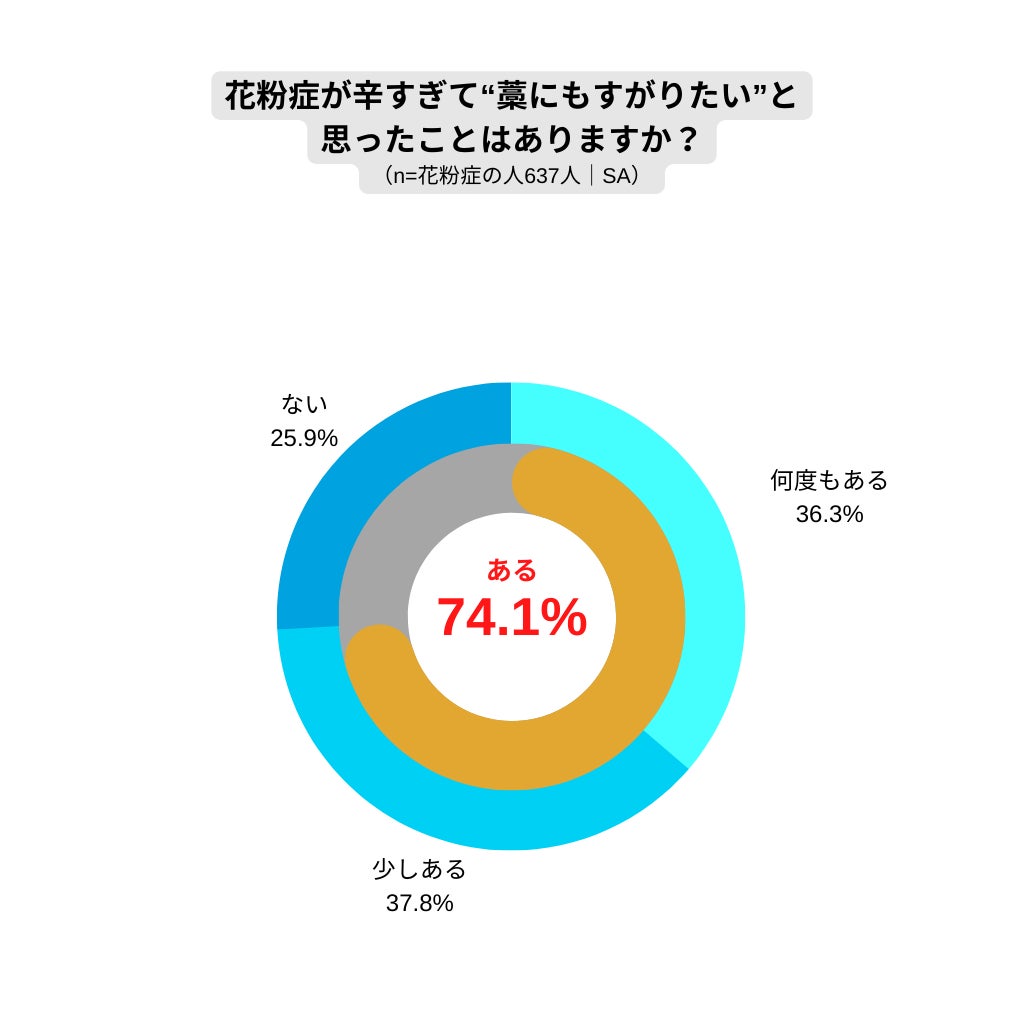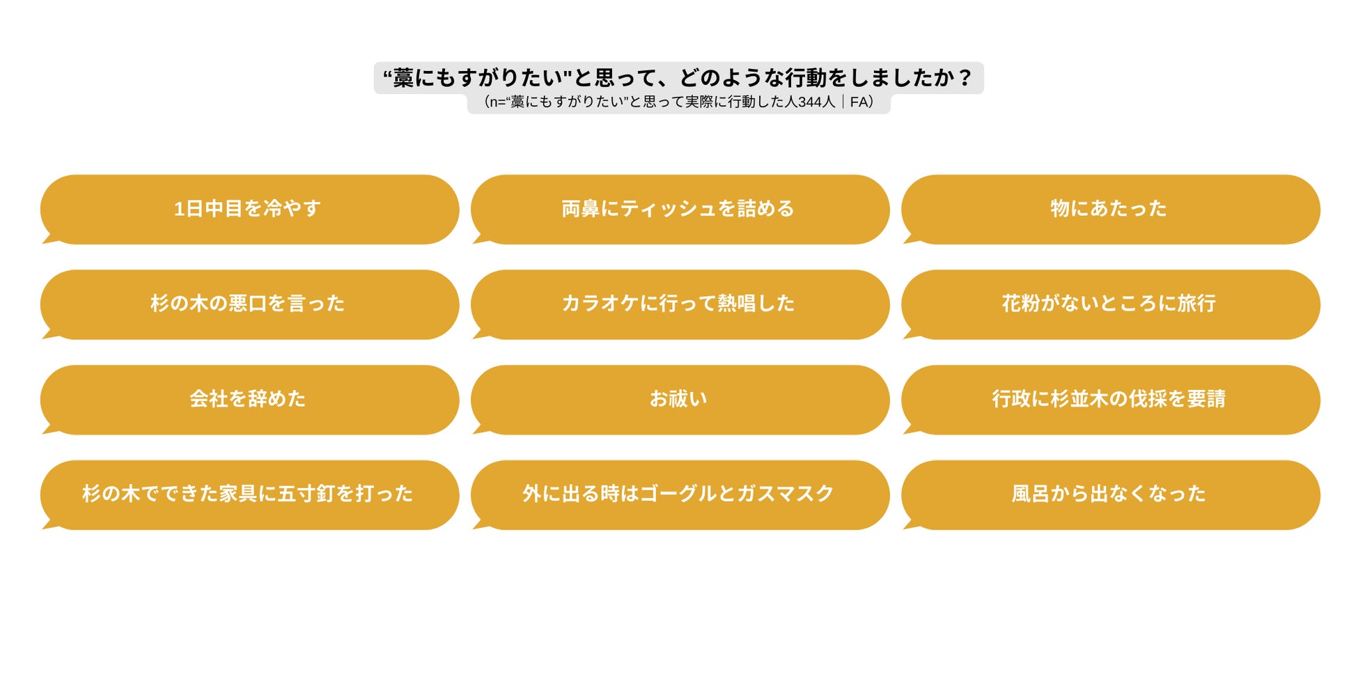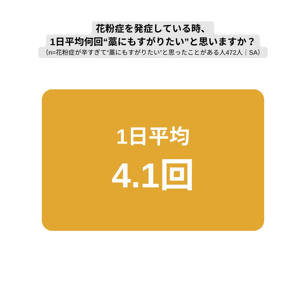 花粉症の人のうち74.1%もの人が、花粉症が辛すぎて“藁にもすがりたい”と思ったことがあると回答しました。その回数は1日平均4.1回で、そのうち実際に“藁にもすがる”ような行動がをとった人は72.8%となりました。どんな行動をとったかについては、「両鼻にティッシュ」「カラオケで熱唱」などのほか、なんと「会社を辞めた」という驚きの“藁すが”行動も見られました。
