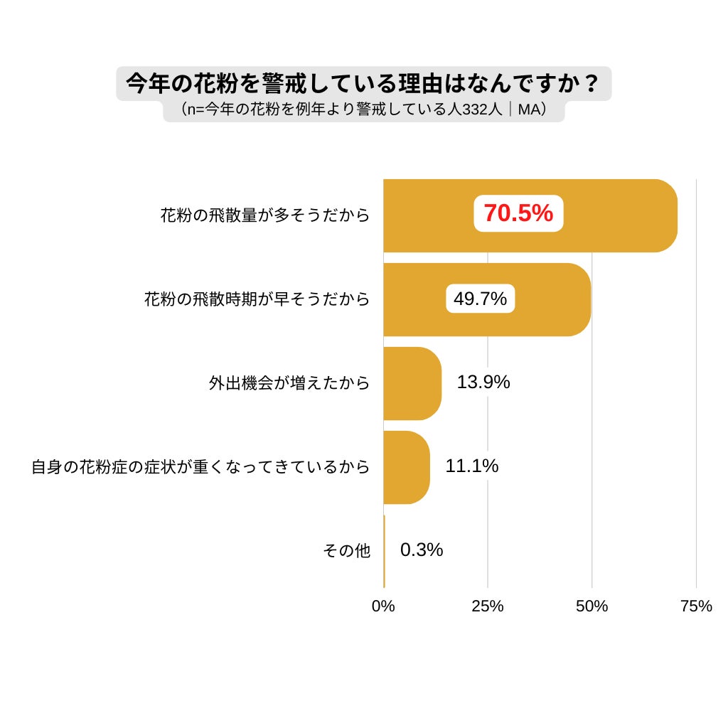 花粉の飛散量が例年より多いと言われている今年、花粉症の人のうち64.7%が例年より症状が出るのが早いと感じ、また47.0%が例年より症状が辛いと感じています。そして半数以上の52.1%の人が今年の花粉を例年より警戒していて、その理由1位は「花粉の飛散量が多そうだから」70.5%ということがわかりました。