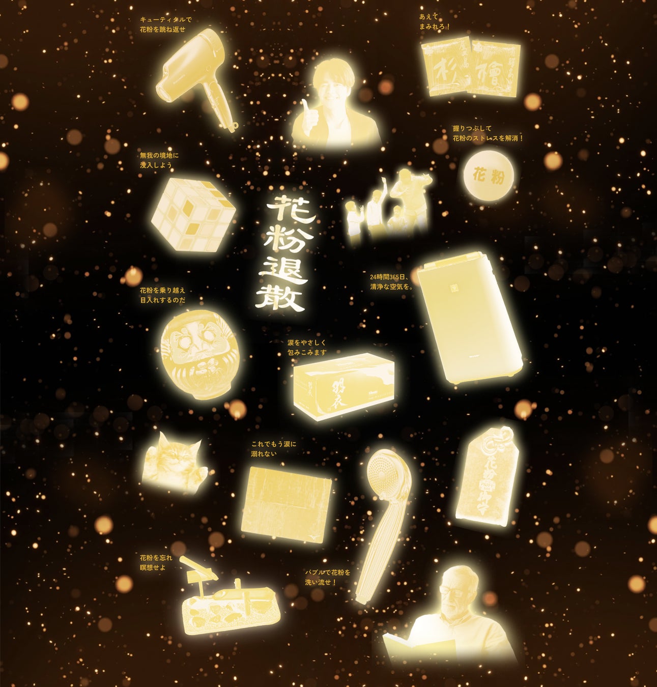 花粉が辛すぎて藁にもすがりたい!そんな瞬間にすぐさま救いの手をお届けするため、ロートアルガードが生み出したコンテンツたち、それが花粉ソリューションです。画像、動画、リアルな花粉対策アイテムなどなど、数々の花粉ソリューションが存在します。※一部は本当に藁のような効果しかない“藁ソリューション”もあるかもしれません。