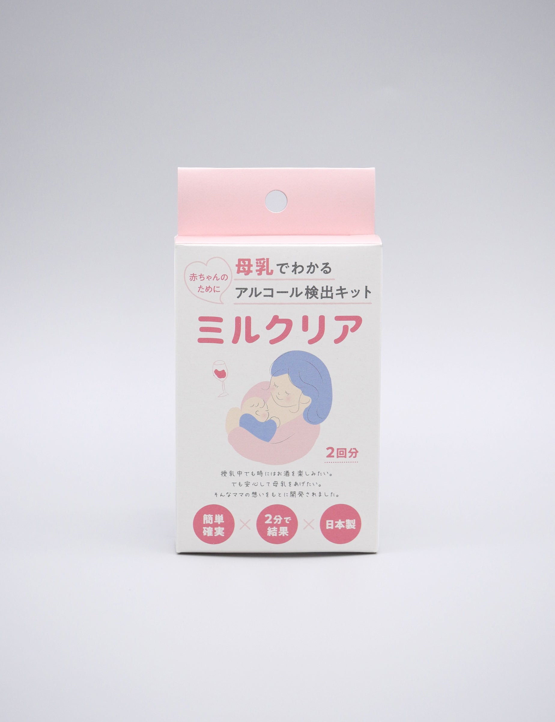 母乳育児を望みながらも、時にはお酒を楽しみたいと考えるお母さんは少なくありません。一般的に、飲酒後はアルコールが分解される目安である2時間以上待ってから授乳することが好ましいとされていますが、お母さんの体調や体格、飲む量などでその代謝時間は一定ではなく、授乳時に不安を持つ方も多いのが現状です。そのような母乳育児の不安やストレスを少しでも緩和するため、母乳中のアルコール濃度を2分で簡単に検査できる「ミルクリア」を開発いたしました。「ミルクリア」は母乳育児中の不安やストレスに寄り添い、安心してより長く楽しい母乳育児を続けることを支援するフェムテック商品です。
