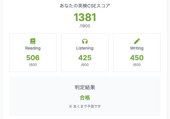 本ツールのCSEスコア算出は英検®公式の計算式に基づくものではなく、過去の受験者データをもとに近似値を算出しています。情報は慎重にチェックしておりますが、あくまで参考情報としてご活用ください。正式な結果は、英検®協会が発表するスコア・合否結果をご確認ください。