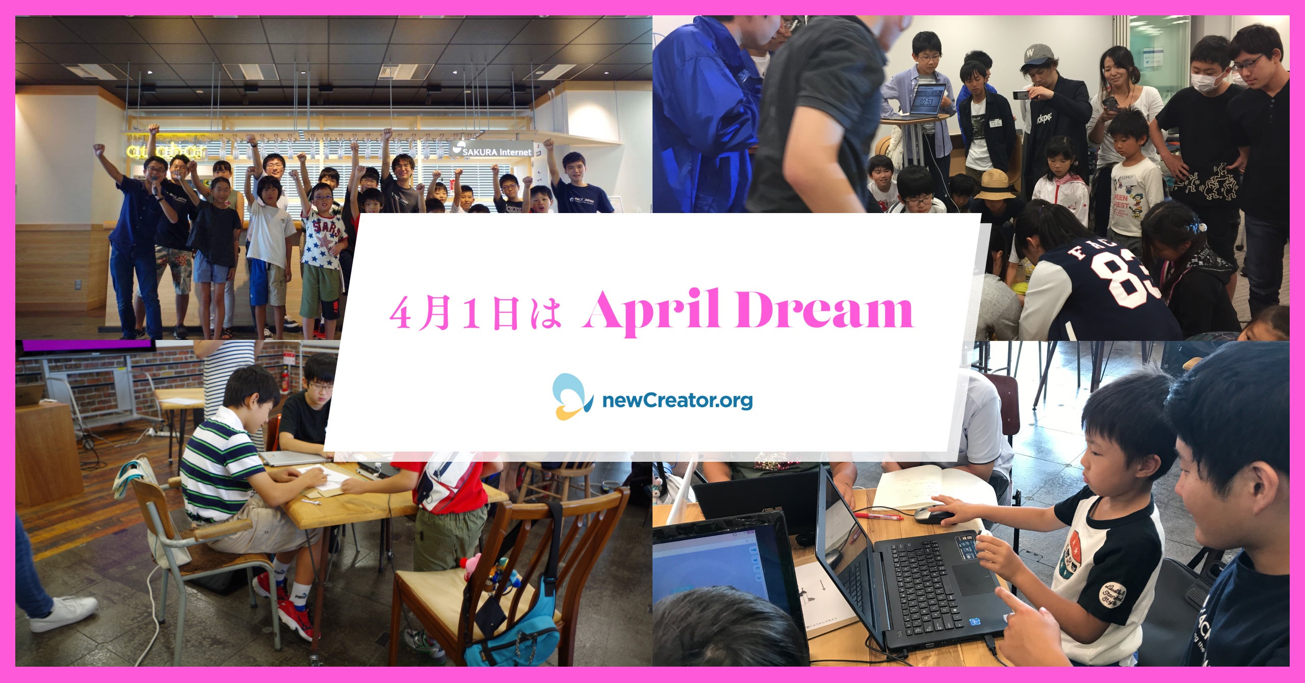 当社は、4月1日を夢を発信する日にしようとするApril Dreamに賛同しています。このプレスリリースは「特定非営利活動法人ニュークリエイター・オルグ」の夢です。特定非営利活動法人ニュークリエイター・オルグ(大阪府豊中市)は、IT体験ワークショップ・イベント「newCreator(ニュークリエイター)」を皮切りに、様々な事業を展開し、「全国の子どもたちがIT教育を受けられる世界」を創ります。