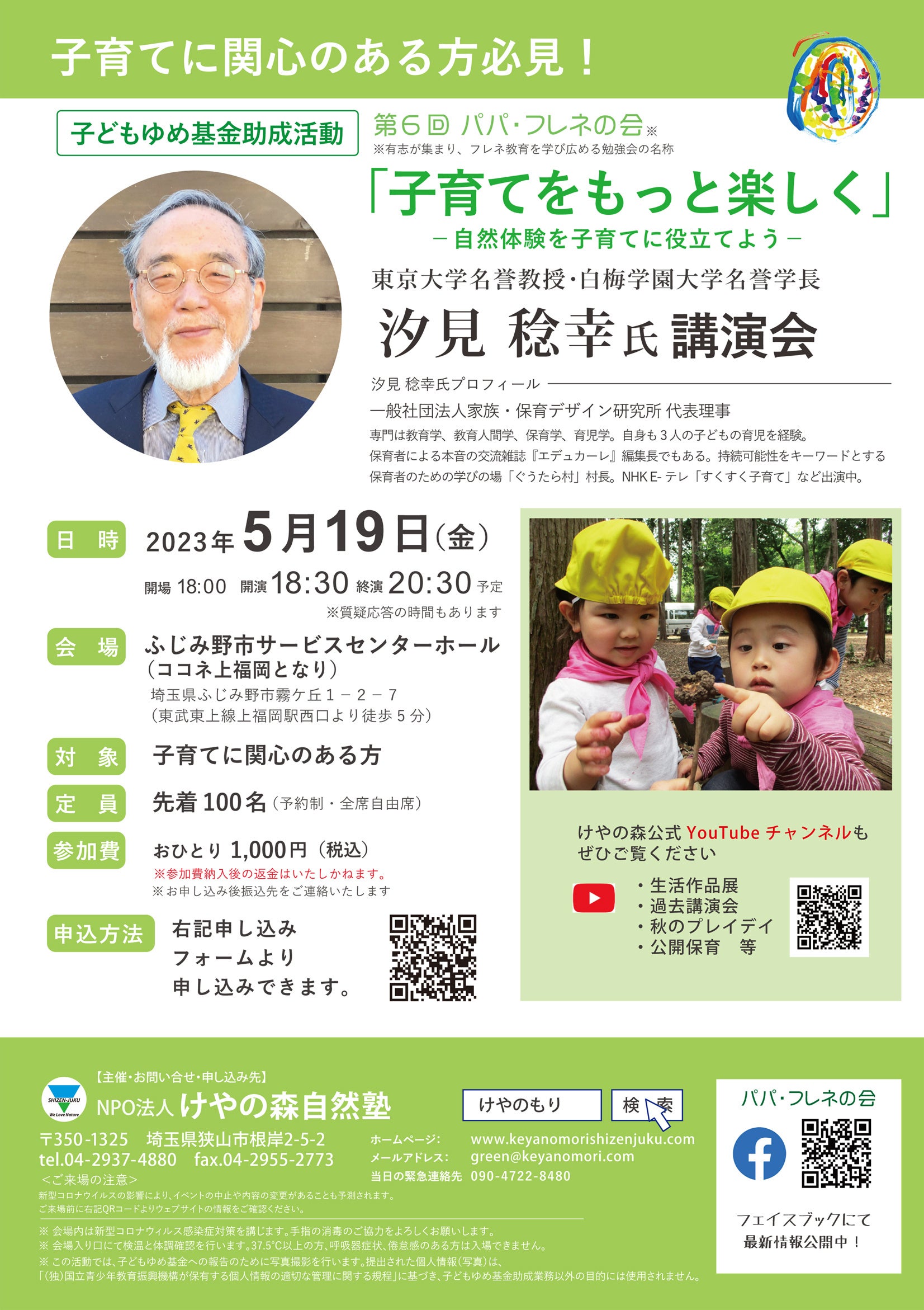NPO法人けやの森自然塾では 識(し)る学ぶ楽しむ 自然の講座 / 汐見稔幸氏講演会 「子育てをもっと楽しく」を開催します。