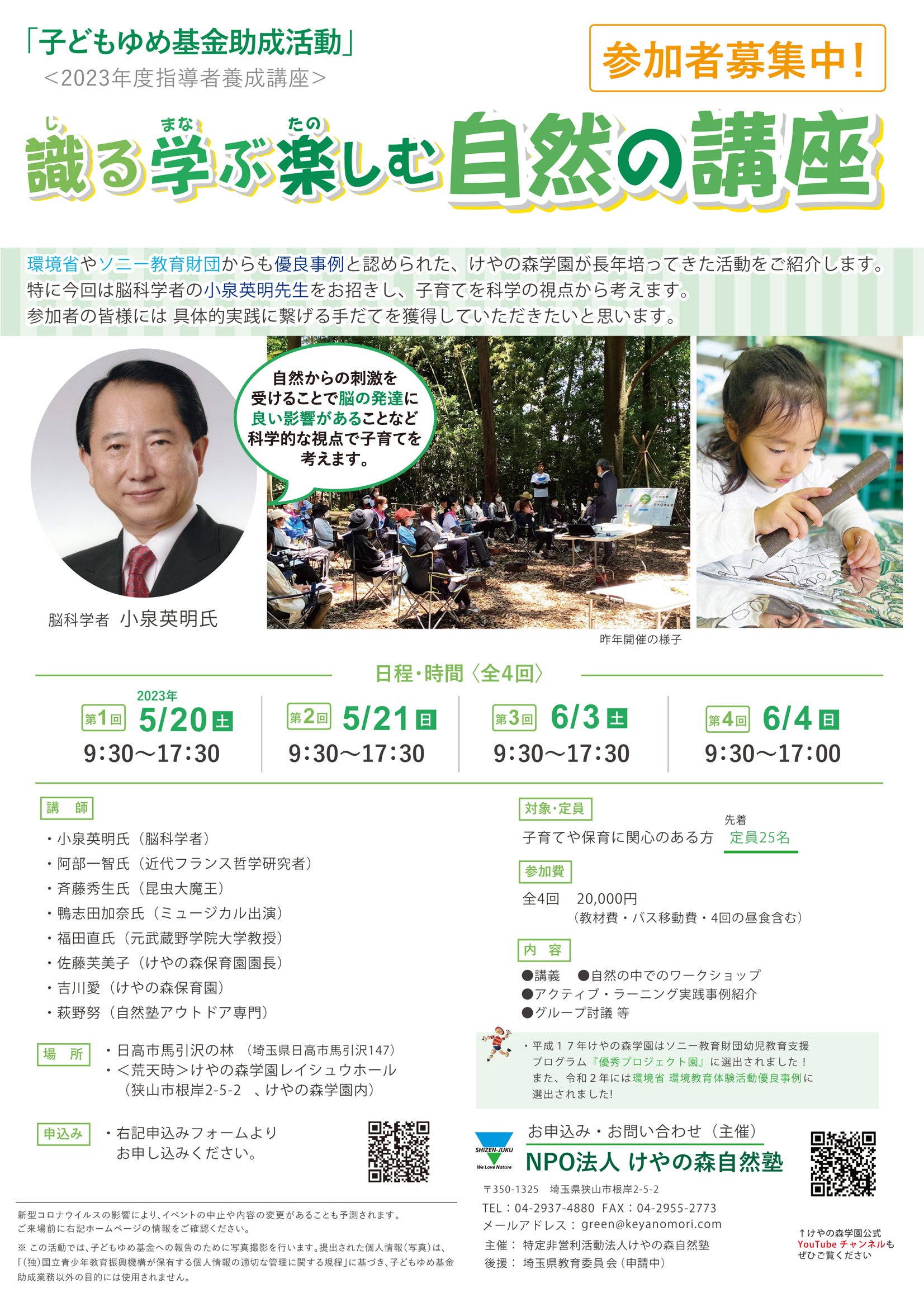 自然の講座はけやの森の活動をご紹介し、今回は脳科学者の小泉英明先生をお招きして、子育てを科学の視点から考えます。