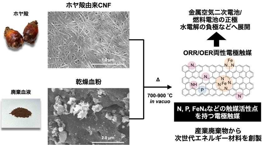 東北大学発スタートアップAZUL Energy株式会社(本社:宮城県仙台市、代表取締役:伊藤晃寿)、東北大学材料科学高等研究所藪研究室、北海道大学、宮城大学からなる研究グループは、産業廃棄物であるホヤ殻中のセルロースナノファイバー(CNF)を炭化すると品質の良い炭素となり、畜産業から出る廃棄血液中にはヘム鉄や窒素・リンなどの元素が含まれていることに着目し、これらを混合・焼成することで様々なヘテロ元素が導入されたナノサイズの「ナノ血炭」が合成できることを実証しました。さらに、得られたナノ血炭は白金炭素触媒などのレアメタルを用いた電極触媒に匹敵する性能を示すことを見出しました。本成果は、処理に困っていた産業廃棄物を、次世代エネルギーデバイスとして期待される燃料電池、金属空気電池やグリーン水素を製造するための水電解システム用電極触媒などへ応用して活用する技術として期待されます。