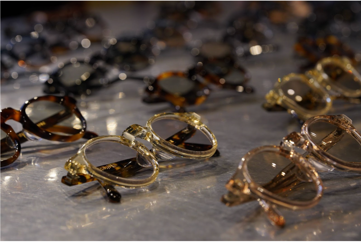 兵庫・北野坂にある自社工場にて、職人が一つひとつ手作業で蝶判の埋め込みや、かしめ、磨きといった作業を行い、細部にまで手をかけてつくり込んだフレームが店内に並びます。他店舗同様、ビスポークを介したオーダー眼鏡の注文も承ります。