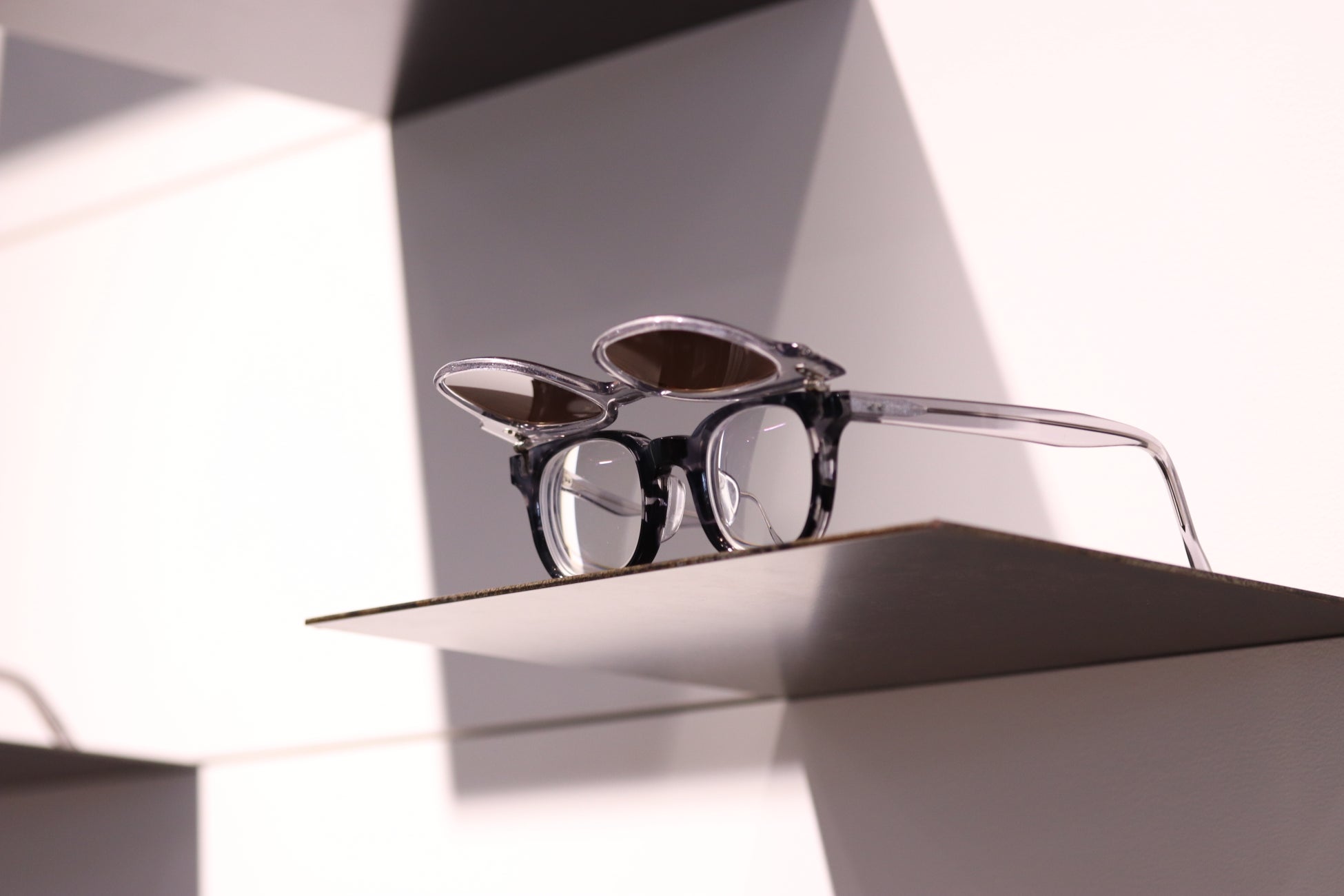 「デザイン面重視の眼鏡」の例として、現在構想中の跳ね上げ眼鏡(※3)は、一般的な量販店で売られているものだと薄さや重さを考慮し、片面は金属の素材を使用することが多いのですが、今回はあえて両面に樹脂素材を使って制作しました。見た目としてもこれまでにないボリューム感のある印象的、かつ違和感のないデザインで制作しました。