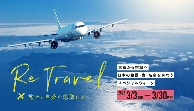 本イベントは「Re Travel―旅する自分を想像しよう―」をテーマに、東京にいながら日本各地の絶景・食・名産を楽しむことができるものです。2022年3月3日(木)~30日(水)の28日間にわたり開催され、ワーケーションに取り組む全国の4自治体が週替わりでイベントを盛り上げます。場所は、東京・丸の内に2021年にオープンしたばかり最新の観光案内施設「Have a Nice TOKYO!」(以下、HaNT(ハント))や、近接するカフェスタンド「Marunouchi Happ. Stand & Gallery」(以下、Happ(ハップ).)。参加地域は、三菱地所関連空港が所在する北海道、静岡、香川、沖縄の4つの地域となります。