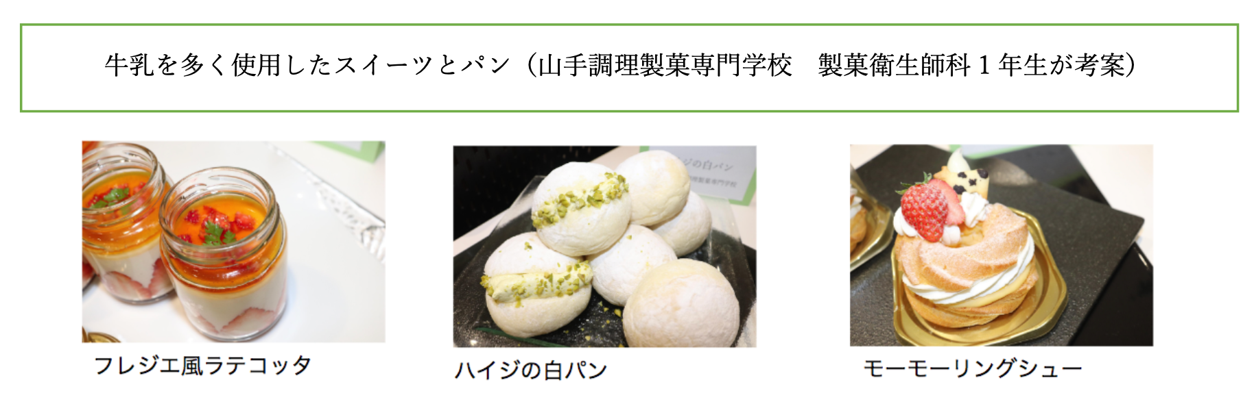 学校法人村川学園はそのプロジェクトメンバーに調理製菓の養成施設として日本で唯一加盟しており、今回、高校生と、本校の学生と協同で、牛乳を多く消費するレシピの開発を行い、社会に課題提唱、解決提案のために、東急プラザ渋谷1Fの「shibuya-san」というイベントスペースにてスイーツ&パンの販売を実施します