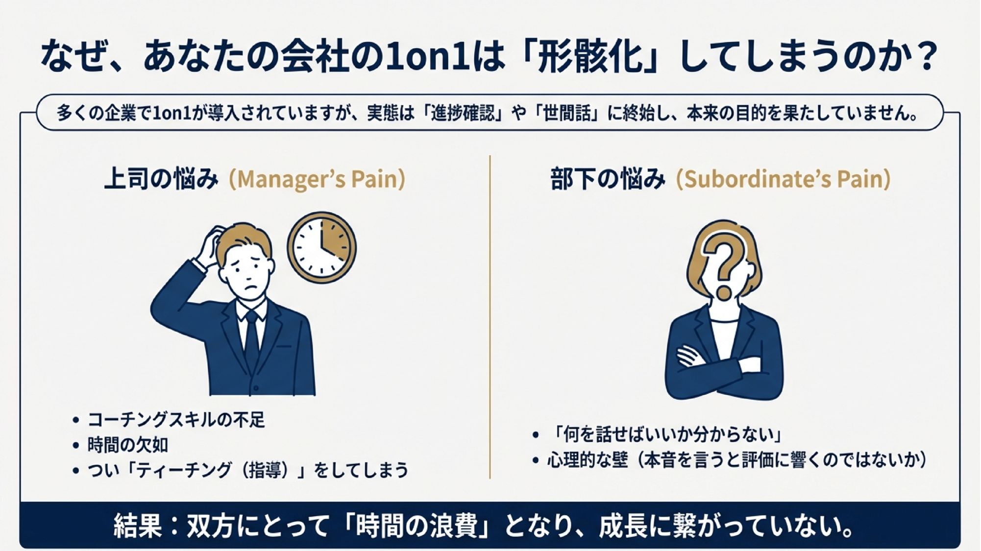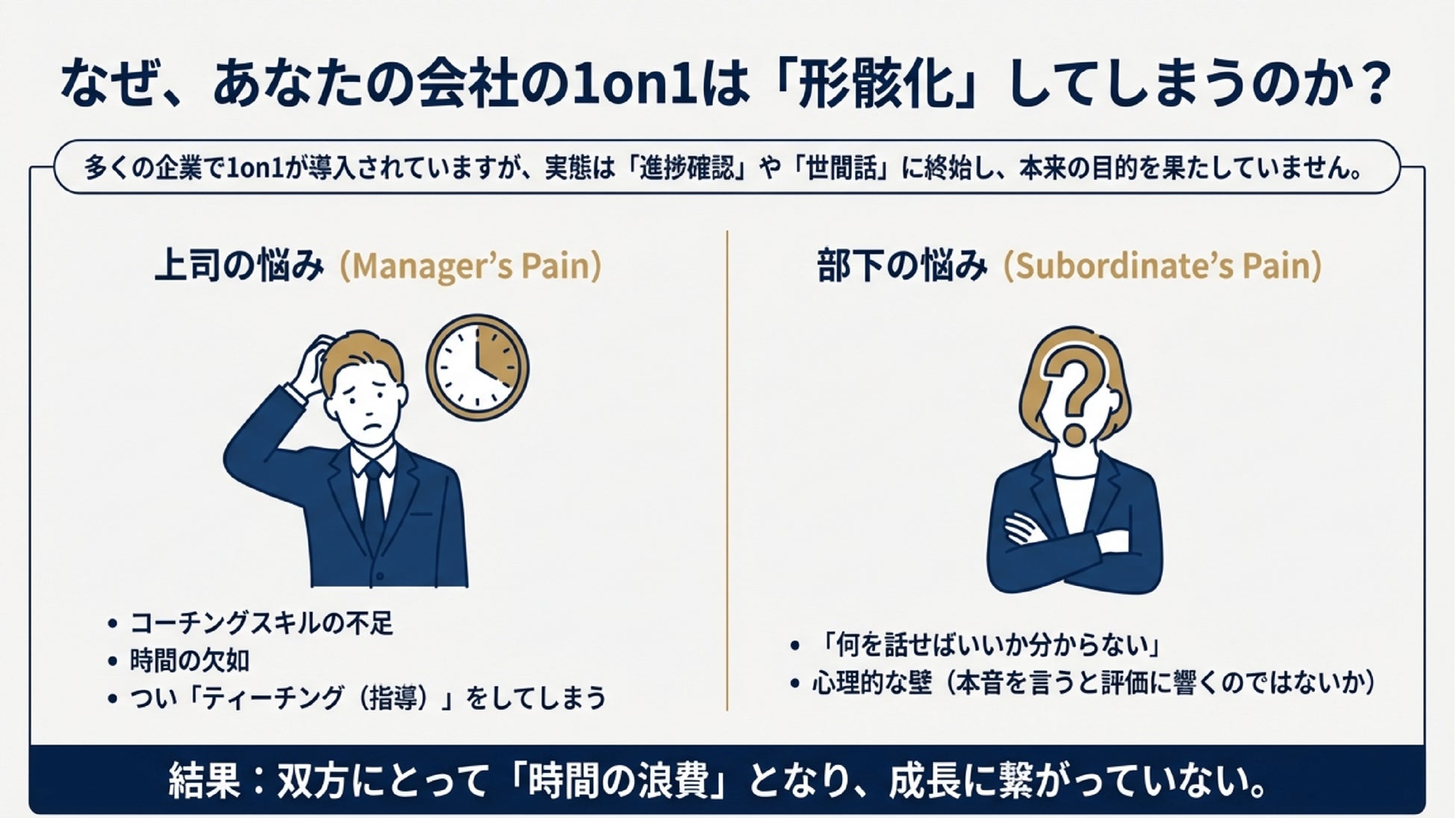 本研修は、多くの企業で導入が進む1on1ミーティングの形骸化・業務報告化・忖度の発生といった課題に対し、「人の主体性(セルフ・コーチング力)」を育むことを軸に、AIを“思考を深めるパートナー”として活用する実践型プログラムです。