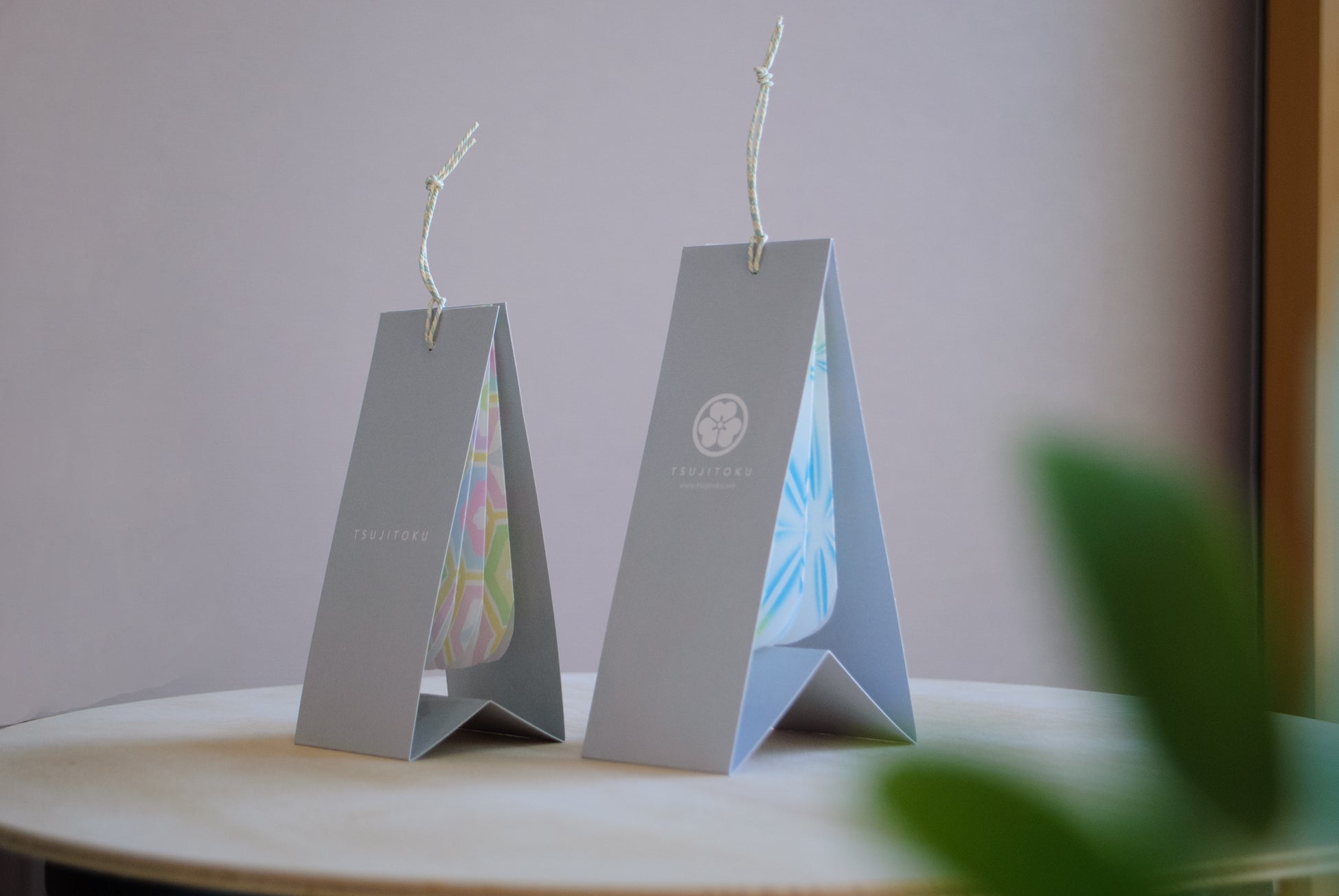 幾重にも重なるという意味の古語「たたなづく」から「tatana-たたな」という名前が生まれました。台紙にセットされている畳まれた懐紙に香りをつけ、香りを手軽に楽しむことができます。(香りはお好みのものをセットすることも可能です)ひも付きの台紙は自立しますので、机の上に置いたり、吊り下げて使ったりすることもできます。また、懐紙の柄、台紙とも、オリジナルの制作を小ヨットから承ります。