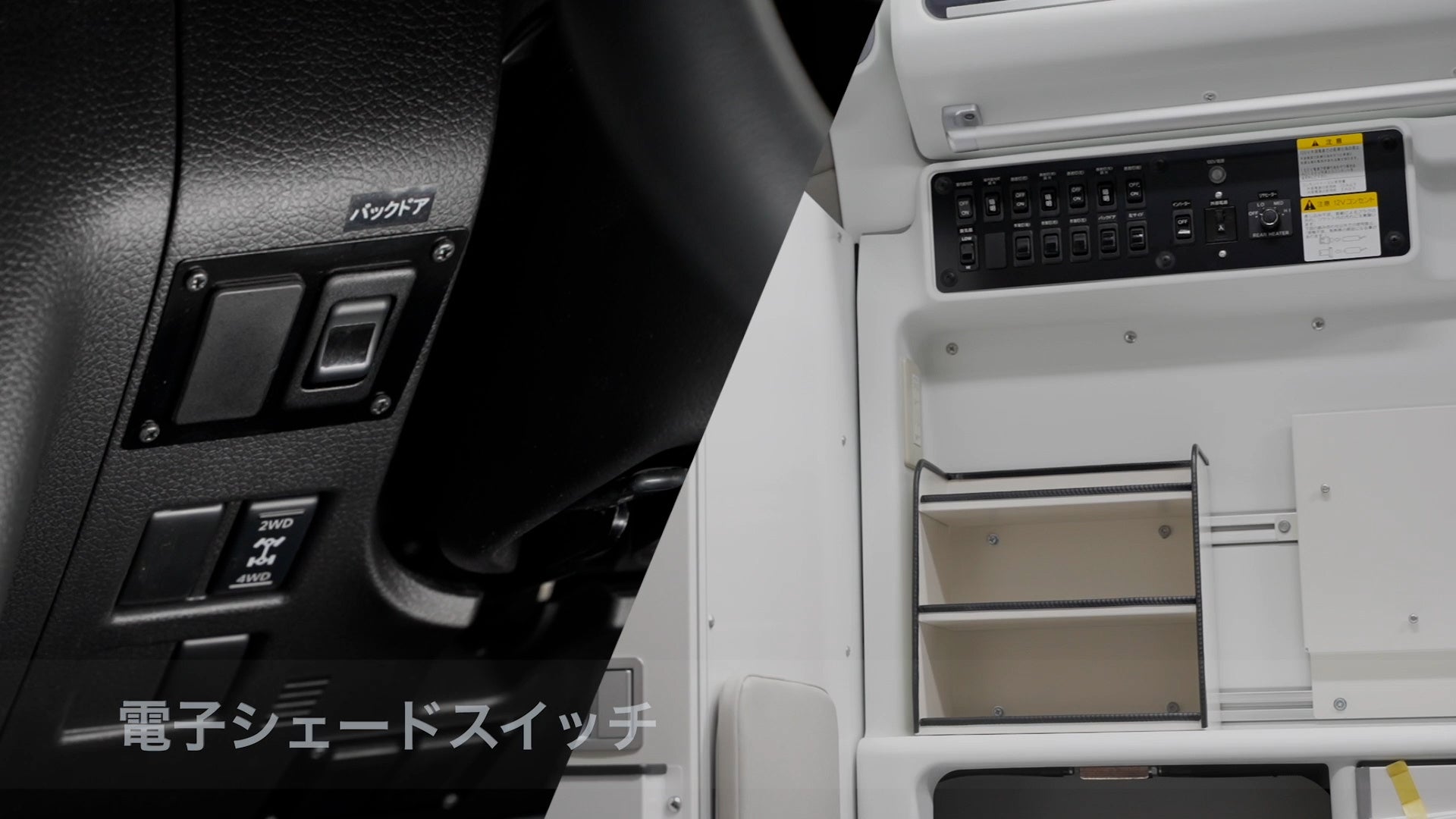 救急車の後部(バックドアガラス・左サイドクォーターガラス・左サイドガラス・左スライドドアガラス前側・後側)のそれぞれ上部1/2に電子シェードは装着されています。
