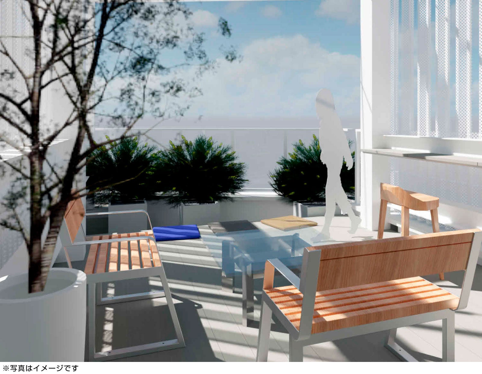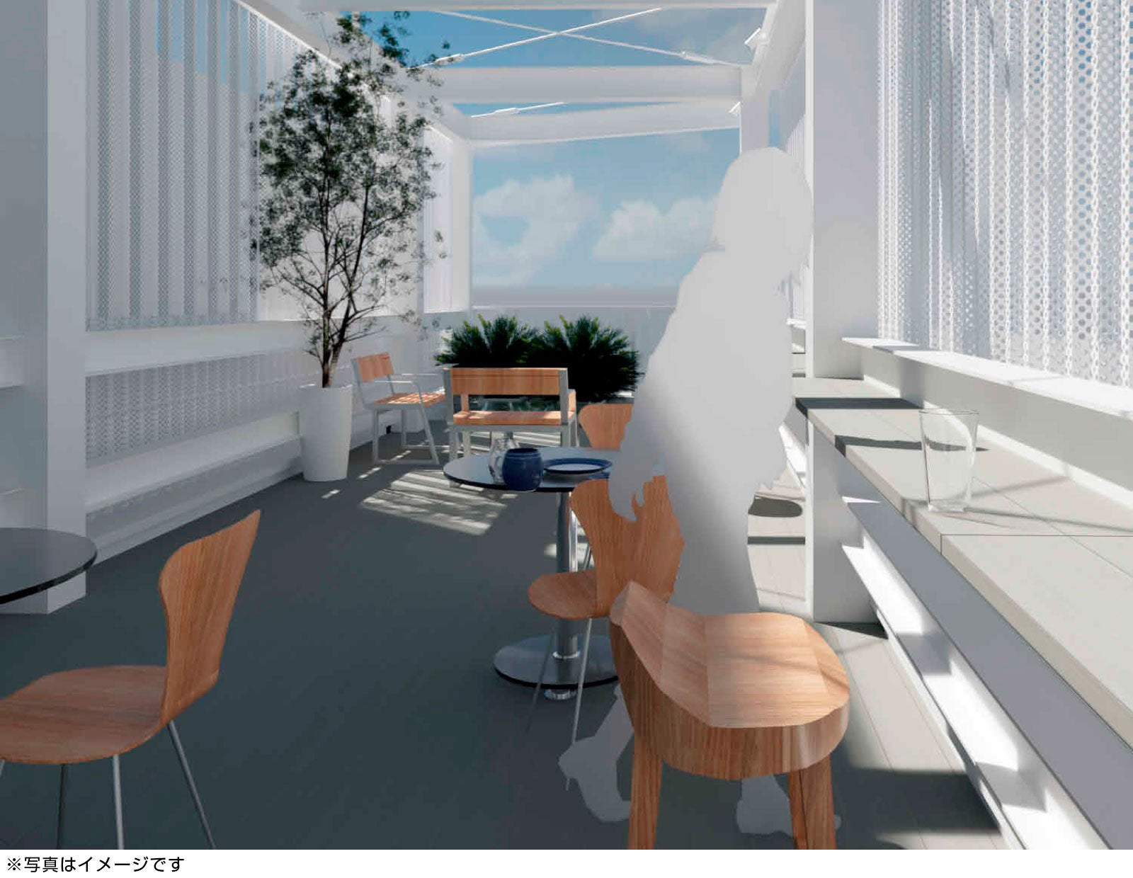 屋上にはテラス空間のレンタルスペースが存在し、ビジネスでのミーティングの場、及び医療系での癒しの場としても、多目的にお使いいただけます(※時間貸しとなります。要相談)。