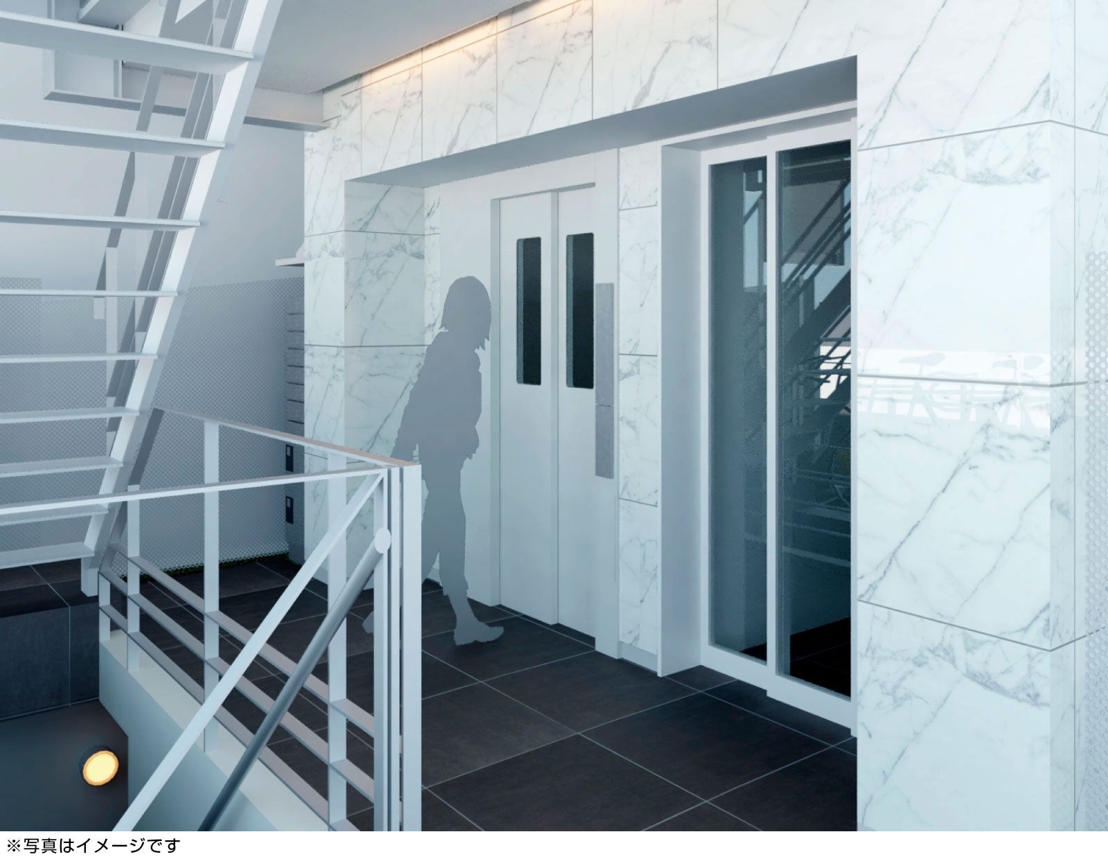 白を基調とした当建物は、より清潔感が高まるようエレベーターを屋内側に開くレイアウトを採用しています。医療系に求められる清潔な環境づくりに一役買っています。
