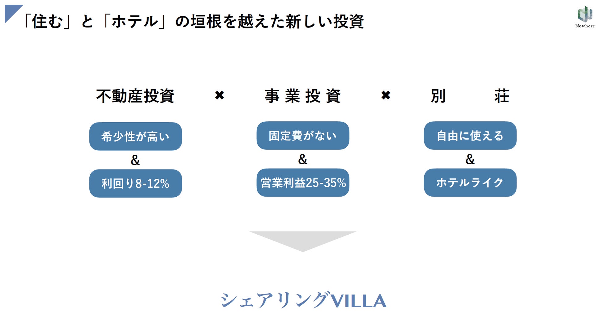 “ホテル”と”住まい”が一緒になっているシェアリングVILLAは、オーナー様が好きなタイミングで使うことができ、使わない間はプロの運営会社(Nowhere)が一棟貸切型リゾートホテルとして運営、収益化を図ります。