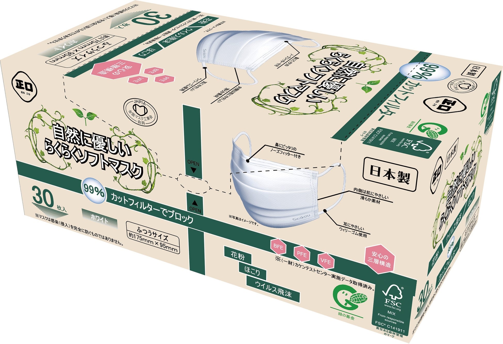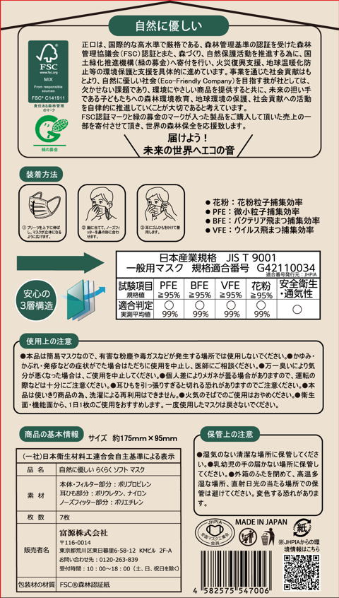 富源株式会社(本社:東京都荒川区、代表取締役社長:吉川 真樹)の自社ブランド<正口>から発売中の「自然に優しいらくらくソフトマスク」(5+2枚入り・30枚入り各種・日本製)がJIS適合審査に合格しました。