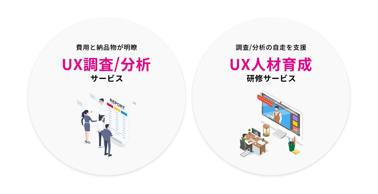 UX調査/分析サービスやUX人材育成研修サービスを、費用・納品物が明瞭なパッケージでご提供します。
