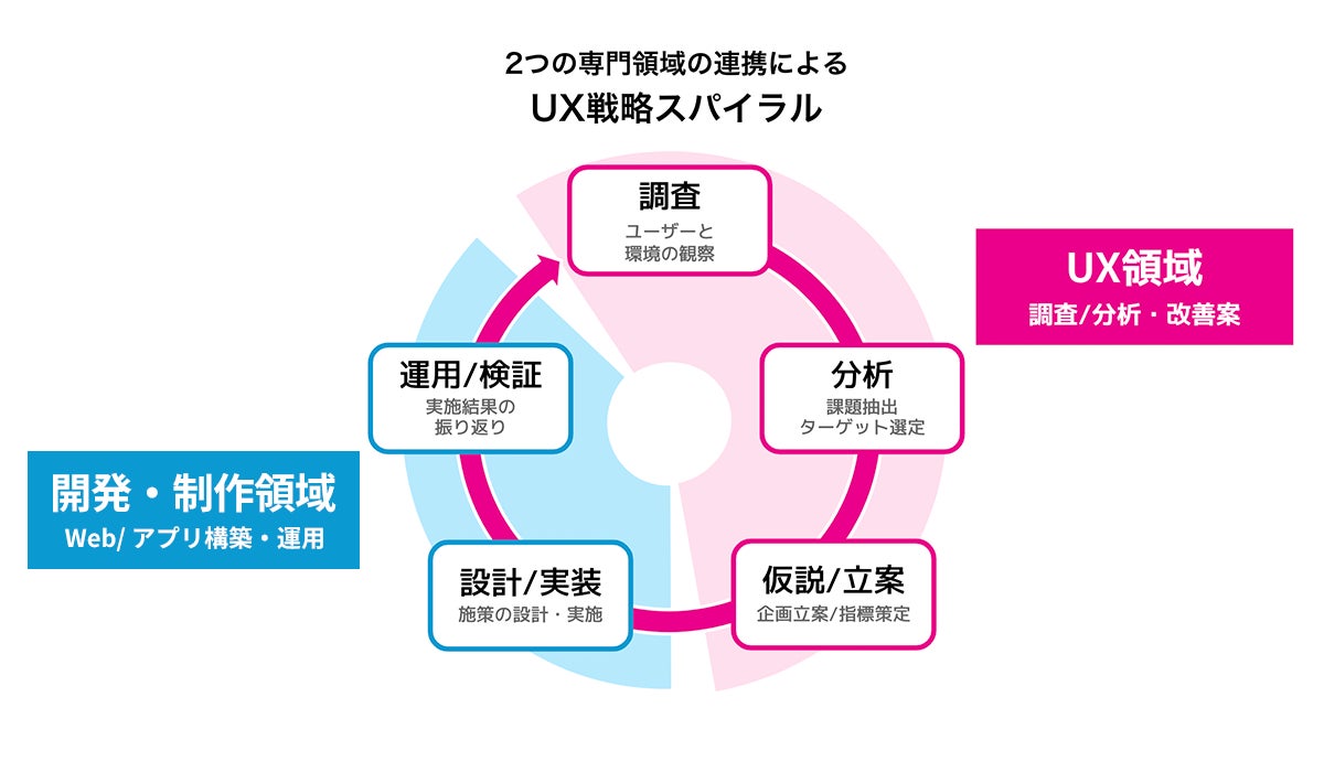 弊社は自社内にUX調査/分析とWebサイト制作・システム/アプリ開発の2つの専門部隊を備えていますので、各分野のプロが連携し、スピーディかつ効果的にUX改善のサイクルを回すことが可能です。