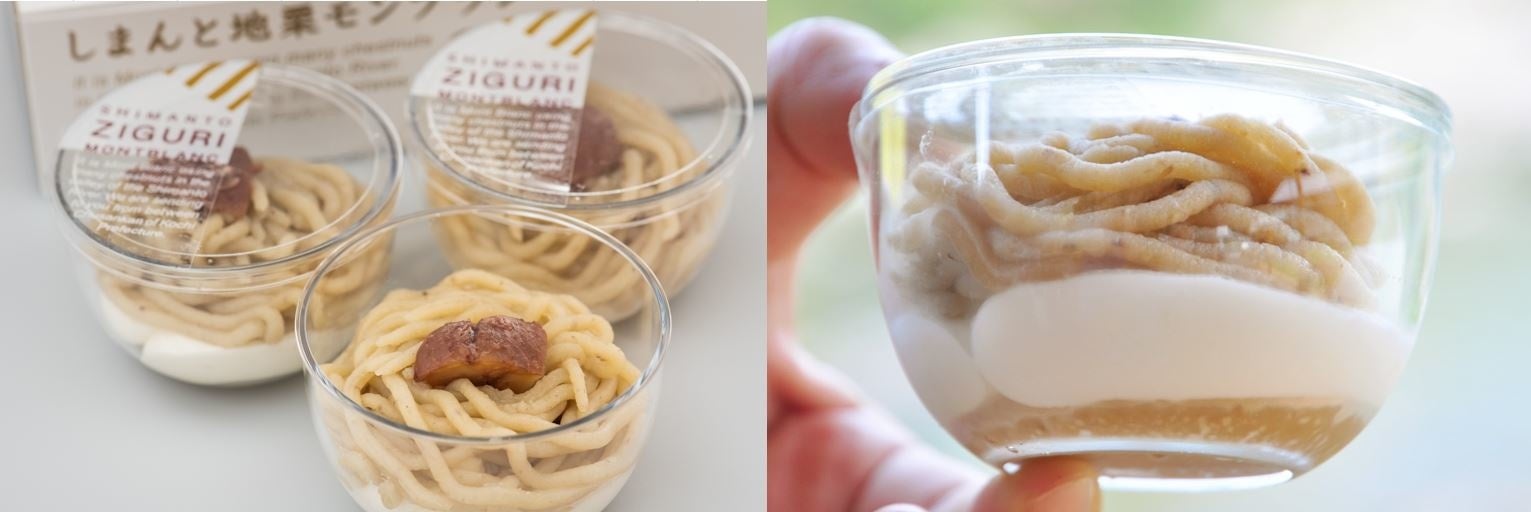 しまんと地栗モンブランの原料に使う「しまんと地栗」は、全国平均サイズに比べて大きくて甘いことが特徴の、四万十川流域で育つ栗のブランド。この地では40~50年前に年間約800tの栗が収穫され、山々は見渡す限り栗・栗・栗の一大産業でした。しかしそこから、農家の高齢化や後継者不足、外国産におされながら次第に産業は衰退し、近年では地域の栗を集めても40~50tほどにまで減少。モンブランの商品化に着手した際、大切にしたのは余計なものはいれずシンプルであること。ローカル×デザインの巨匠である梅原真デザイナーの息吹が吹き込まれ、しまんと地栗はモンブランに乗って全国に広まりました。