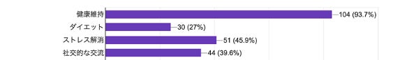 「健康維持」と答えたシニアは93.7%と圧倒的多数で、いずれの年代も9割以上の方が回答。ついで、「ストレス解消」45.9%、「社交的な交流」39.6%と続き、運動がシニアにとって精神的、社会的な利益をもたらす手段であることが示されています。
