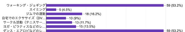 現在取り組んでいる運動は「ウォーキングやジョギング」と「ダンスやエアロビ」が同率で53.2%とトップ。次いで「ジムでの運動」16.2%「ヨガやピラティス」13.5%、「サークル活動」11.2%がランクイン。