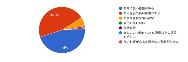「非常に良い影響がある」と答えたシニアは45.9%、「ある程度の良い影響がある」45%と過半数のシニアは、運動によって身体的または精神的な変化を感じているという結果になりました。