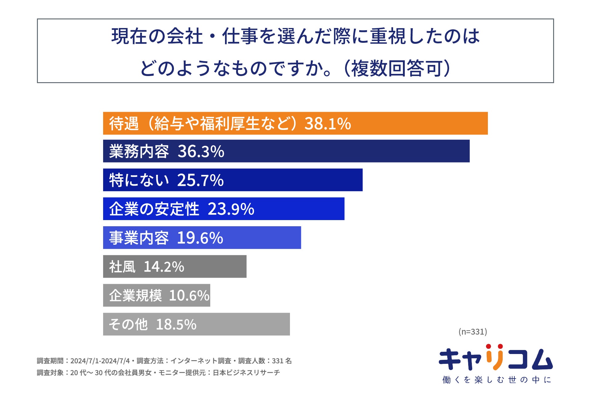 次に「現在の会社・仕事を選んだ際に重視したのはどのようなものであったか」を尋ねる設問の回答で多かったのは1位「待遇(給与や福利厚生など)」で38.1%、続いて2位「業務内容」で36.3%、3位「特にない」で25.7%となりました。この結果から、「やりたいこと」よりも、「待遇」を重視して会社・仕事選びをしている人の方が多い、という実情がわかりました。
