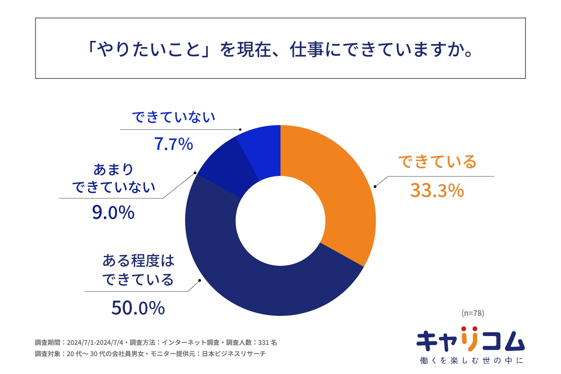 続いて前項の質問で「やりたいこと」を基準にして仕事選びをした、と回答された方に「やりたいことを現在、仕事にできているか」を問う設問の回答では、「ある程度できている」が最も多く50.0%、次いで「できている」が33.3%で続く形となり、合計すると80%を上回る結果となりました。ここから、「やりたいこと」を基準に仕事選びをした方の大半が程度の問題はありますが、「やりたいこと」を仕事にできている、と感じていることが判明しました。
