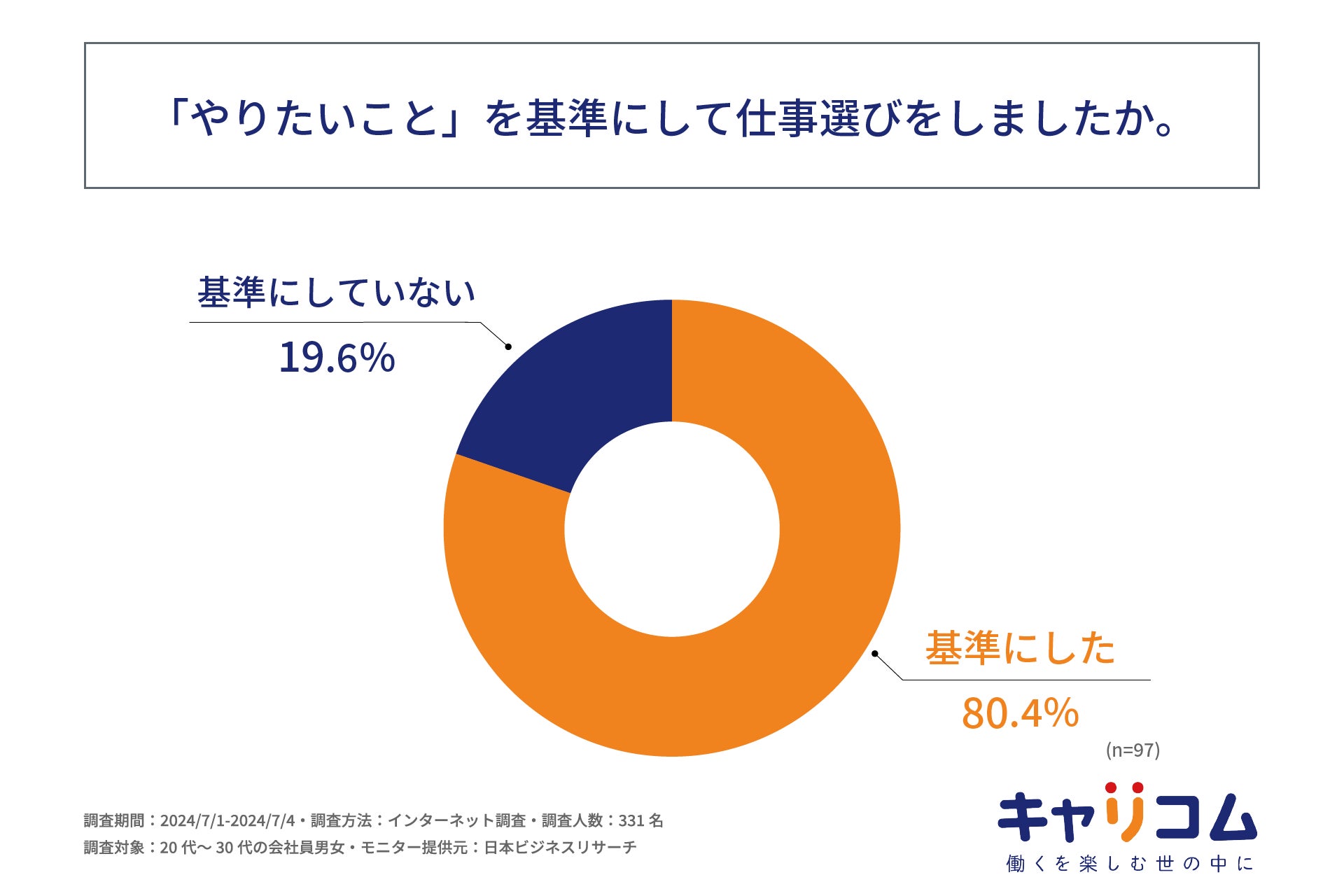 また、前項の質問で「あった」と回答された方に「やりたいことを基準にして仕事選びをしたか」を尋ねる設問では「基準にした」と回答された方が80.4%という結果になりました。この結果から「やりたいこと」がある人に関しては就職先や仕事選びにも「やりたいこと」を反映させている方が多数派であるとわかりました。