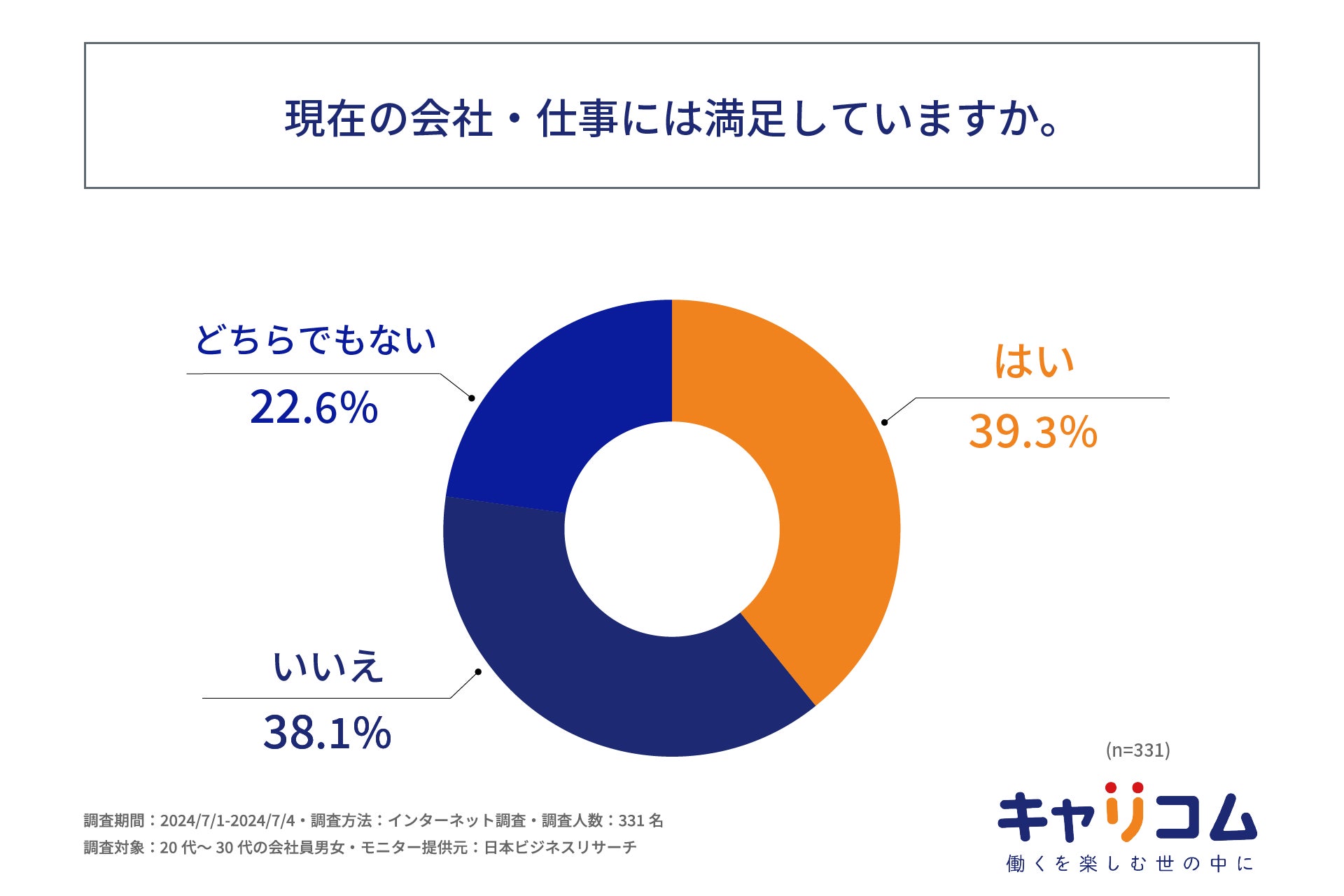 まず、「現在の会社・仕事に満足している」を尋ねる設問への回答では、「はい」が39.3%、「いいえ」が38.1%、「どちらでもない」が22.6%という結果となりました。「はい」と明言できている方は約4割で、6割の方は「満足している」とは言えないという事実がこの結果から明らかになりました。