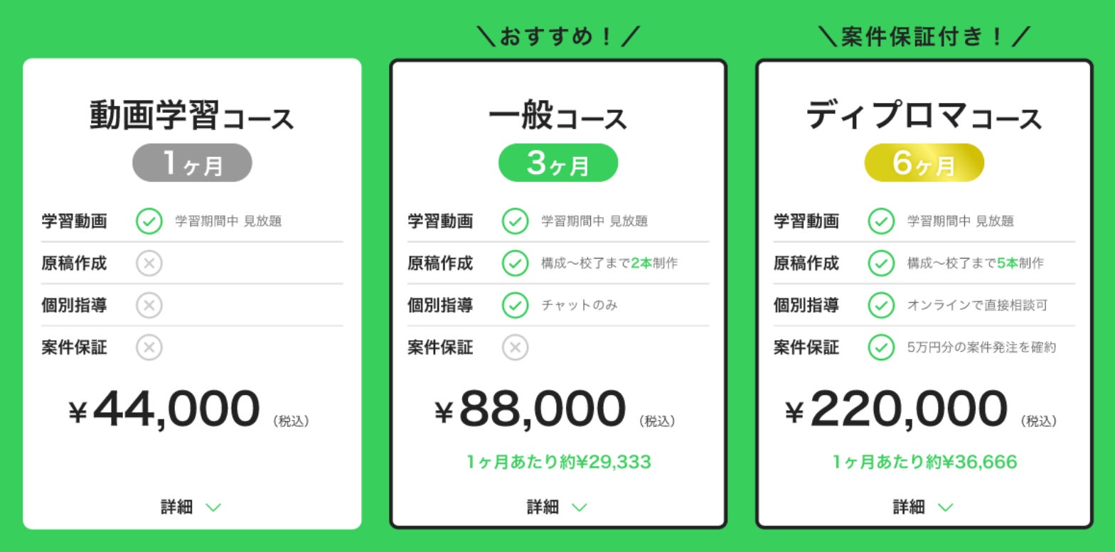 ディプロマコース受講の方は、スクール卒業後に5万円分の記事制作保証が付いています。