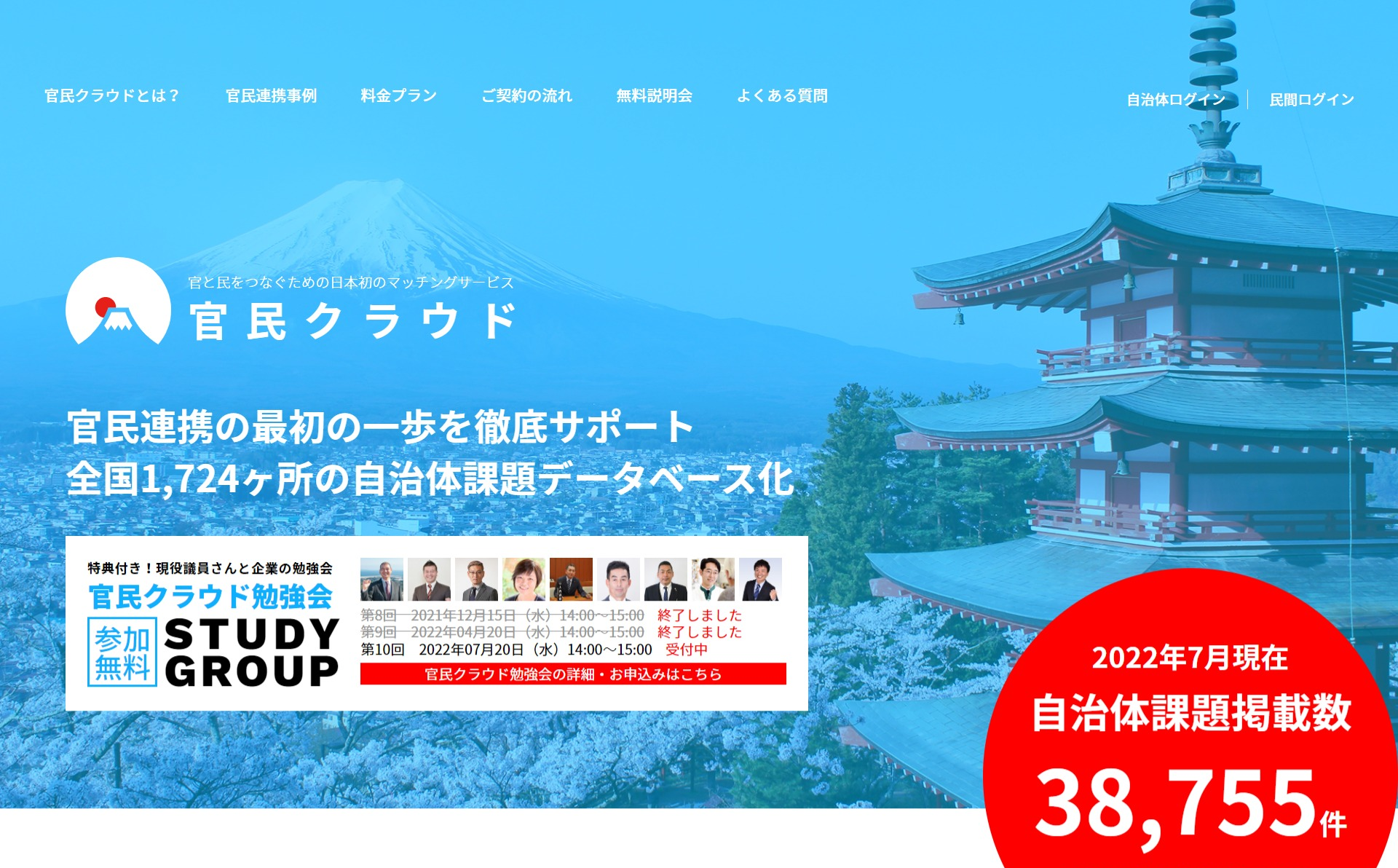 自治体との官民連携を目指す民間企業のこういった悩みを手助けし、官民連携の最初の一歩をお手伝いするのが官民クラウド官民クラウド(https://kanmincloud.com/)です。
