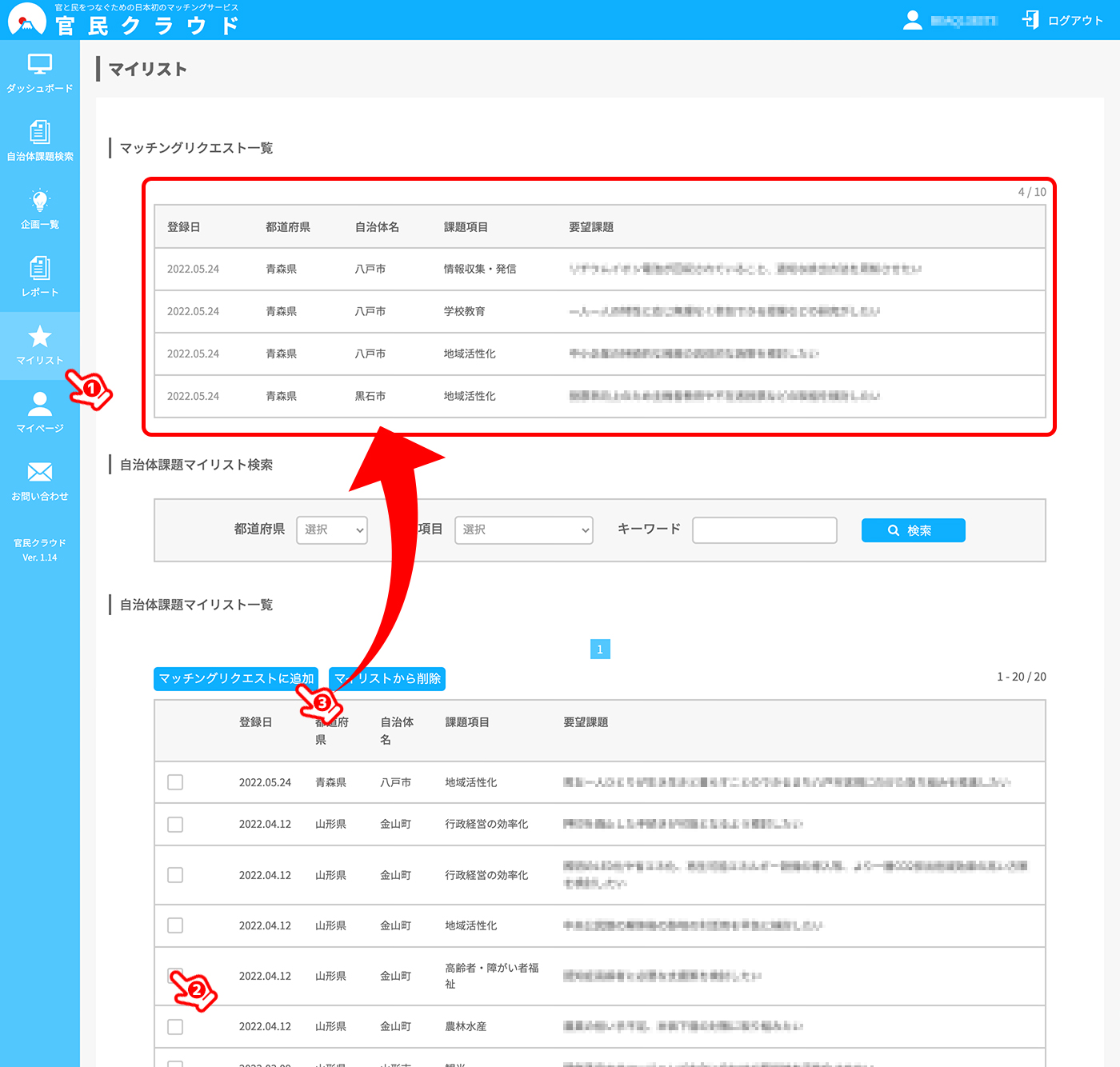 - 気になる自治体課題をマイリスト登録をし、アプローチする自治体課題を選出します。