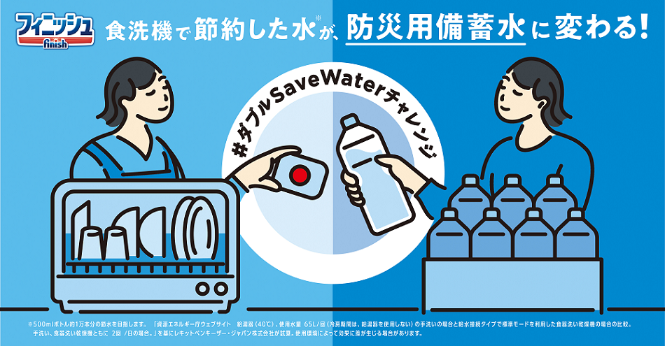 こうした現状と、【一度の食器洗いで手洗いが約65ℓの水を使用するのに対して、食洗機利用は約14ℓに留めることができる※3】という事実を踏まえ、「フィニッシュ」では、食洗機ユーザーのみなさまと一緒に、食洗機利用を含む節水アクションの価値を発信するプロジェクト「#ダブルSaveWaterチャレンジ ~食洗機で節約した水が、防災用備蓄水に変わる!~」を発足いたしました。