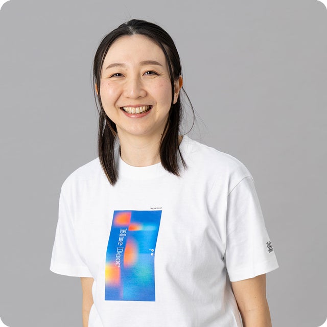 ブルーのドアが描かれたシンプルなデザインのTシャツ。
