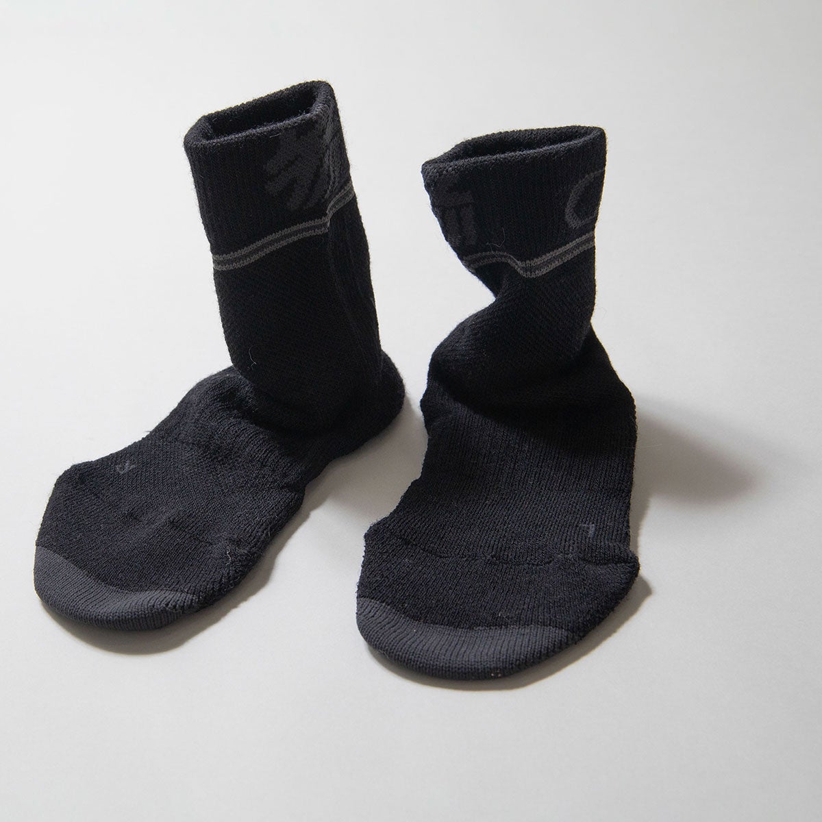 綿や化繊素材は使用していくと徐々に「薄く」「硬く」なっていきますが、メリノウールはその「こし」の有る特性から長時間の移動や大量の汗や雨でもクッション性が持続されます。