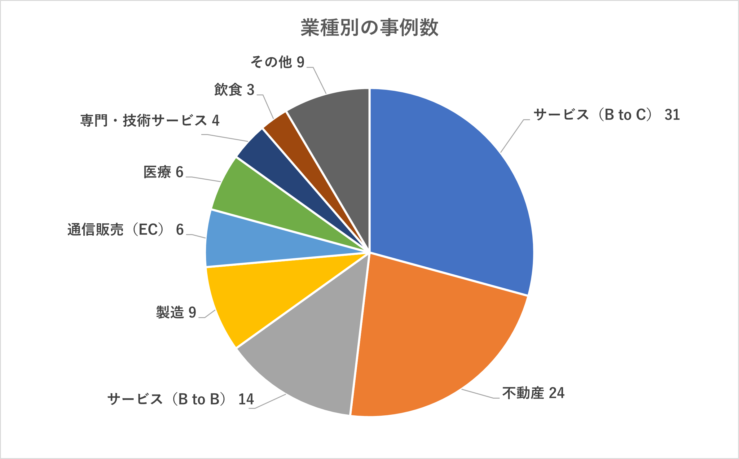 全106件の公開件数のうち業種別の事例数は、サービス(B to C)31件、不動産24件、サービス(B to B)14件、製造9件、通信販売(EC)6件、医療関係6件、専門・技術サービス4件、飲食3件、その他9件です。