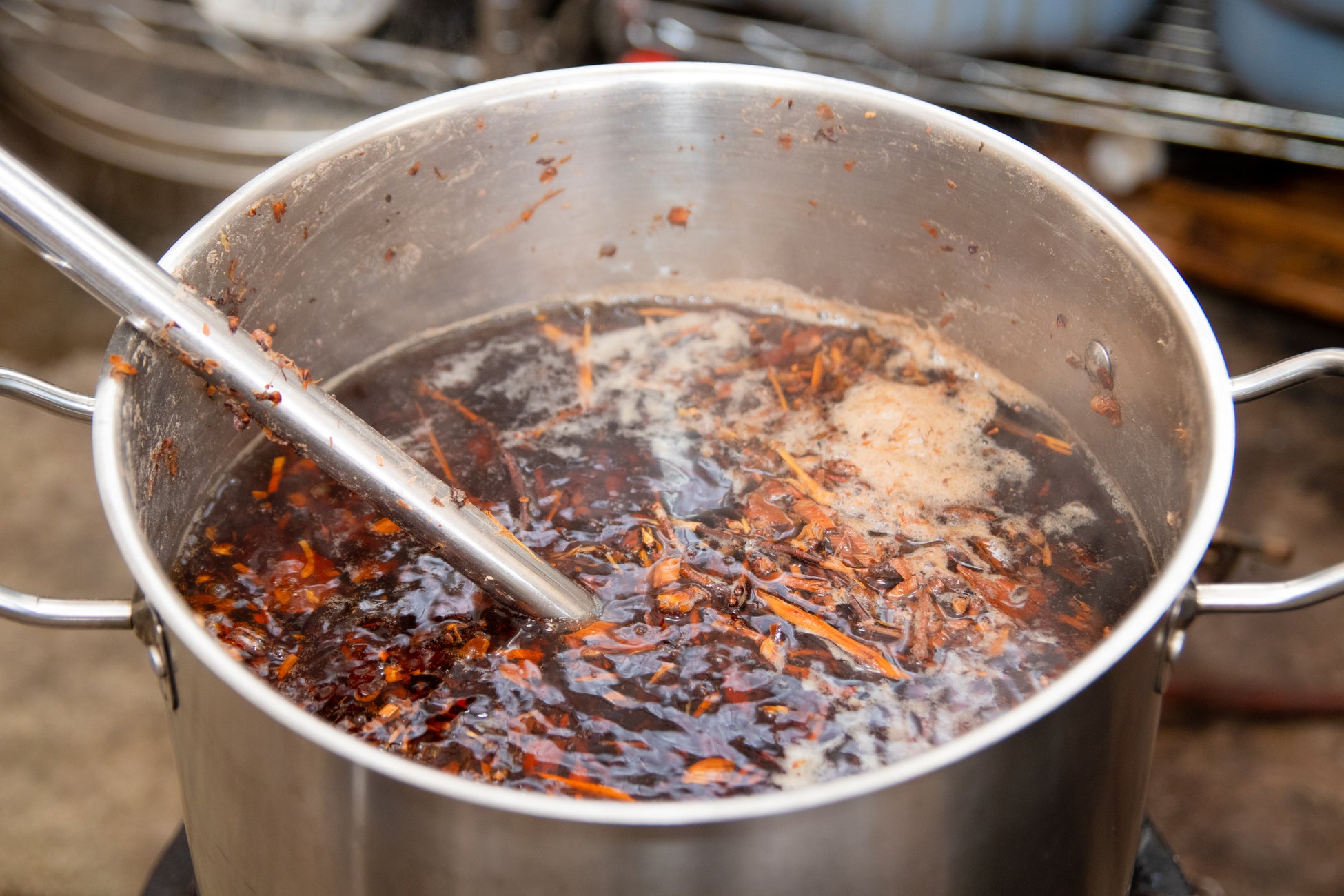 桜の枝を細かくし、時間をかけて煮出して染料を抽出します。