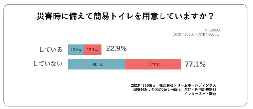 2023年11月に株式会社ドリームホールディングス (福岡県福岡市、東京都港区・代表取締役 小濵 洋一/以下、ドリームホールディングス)は、全国の20代~60代の男女1000人を対象に「災害時に備えて簡易トイレ(※)を用意していますか?」についての調査を実施。