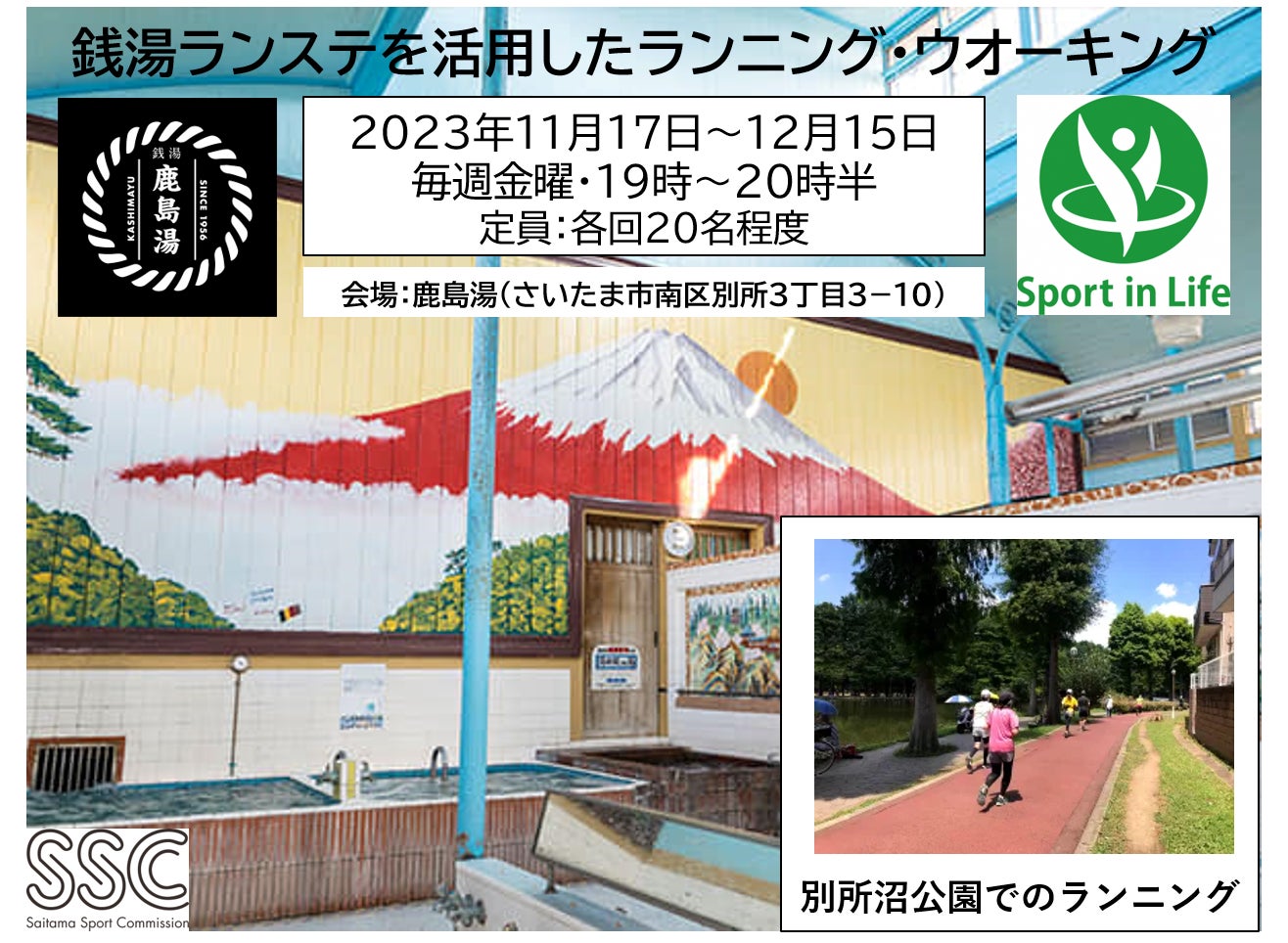 令和5年11月17日-12月15日(毎週金曜19時より)に鹿島湯(さいたま市南区)にて、「銭湯ランステを活用したランニング・ウォーキング」を開催いたします。