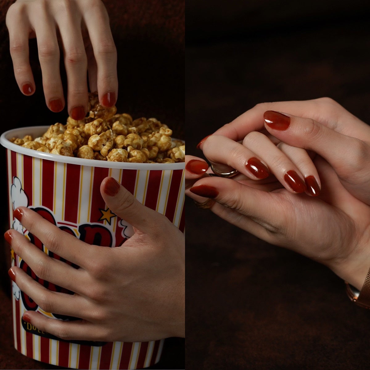 キラキラと輝く深みのある赤に、暗い輝きも混ざる魅力的なネイルカラーです。