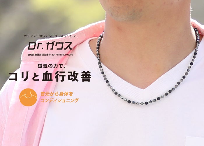 ボディアジャストメント®ネックレス「Dr.ガウス®」は、【首元から身体のコンディショニング】をコンセプトに開発された、家庭用永久磁石磁気治療器として管理医療機器の認証を受けたネックレスです。磁気の力で装着部位のコリと血行を改善。遠赤外線効果の天然シリカ鉱石を使用し遠赤保温効果が期待できます。
