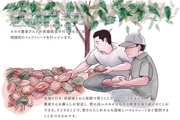 自宅にいても、『カカオを取り巻く環境』や『良質なカカオ豆ができるまで』がわかるように、UMEYA BRAINERYの取り組みがわかるストーリーブックを『Bean to Bar 手作り体験キット』にお付けします。