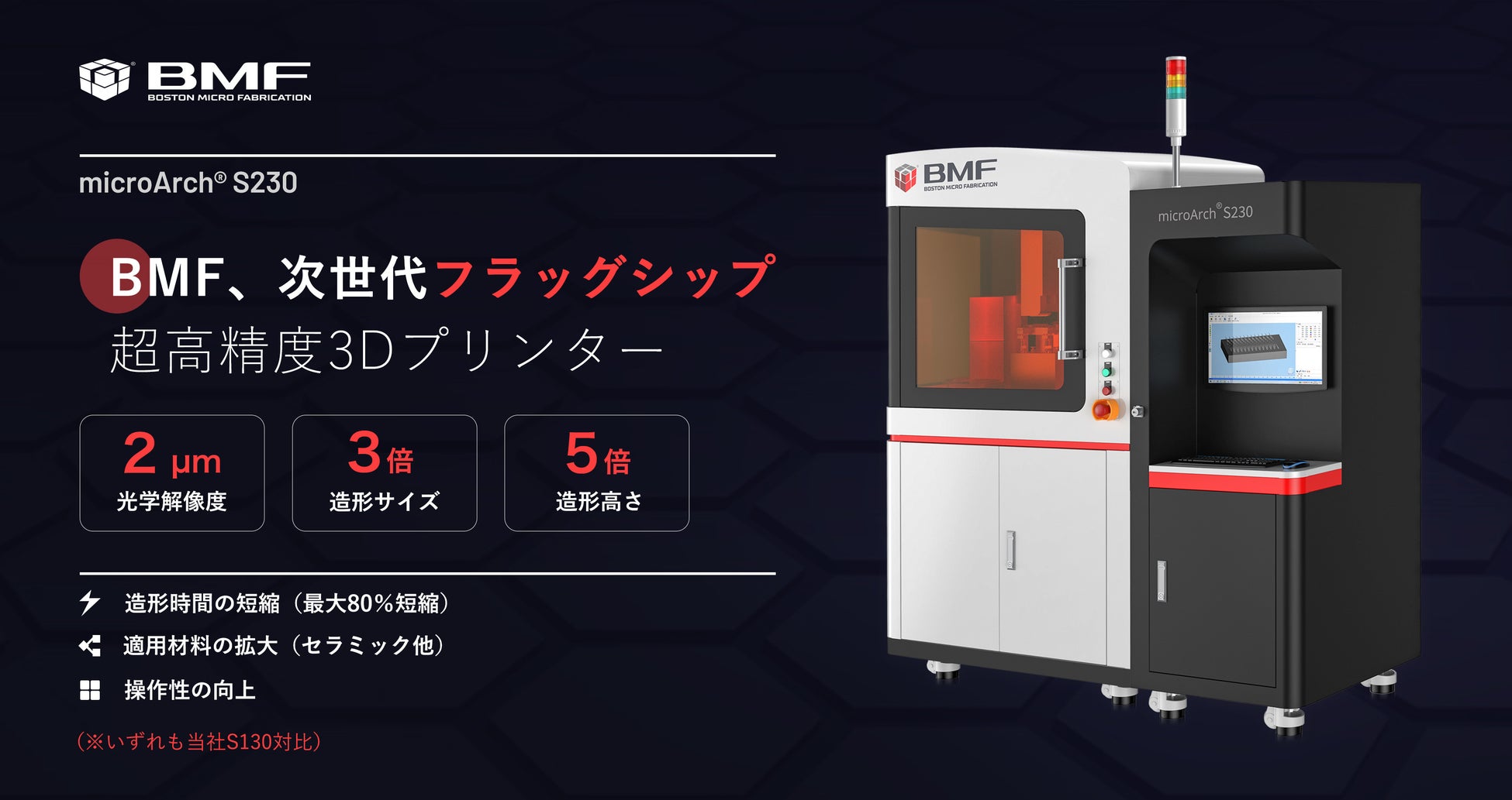 精密製造分野で世界トップクラスの精度を誇るマイクロスケール3DプリンターメーカーであるBMF(Boston Micro Fabrication、ボストン・マイクロ・ファブリケーション)は2µmシリーズの次世代超高精度3Dプリンター「microArch®S230」を4月18日(月)より正式に販売開始致します。