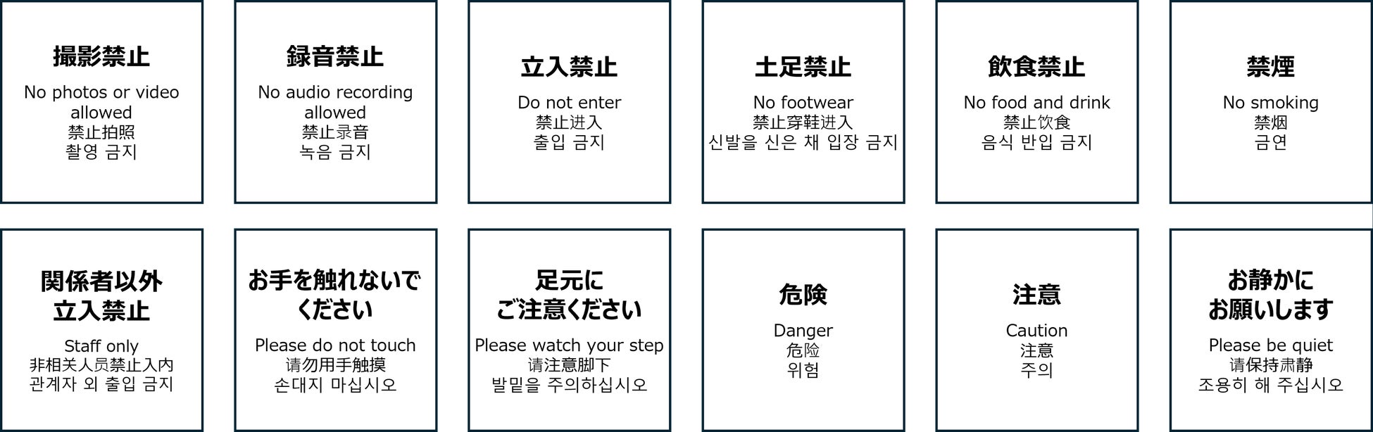 イベント会場内で使用頻度が高いサインやキャプションの文言を抽出し、あらかじめ多言語表示のサンプルデータを作成しました。これにより、スムーズに運営マニュアルに反映することができ、訪日外国人が迷うことなくイベントを楽しめる環境を整備します。