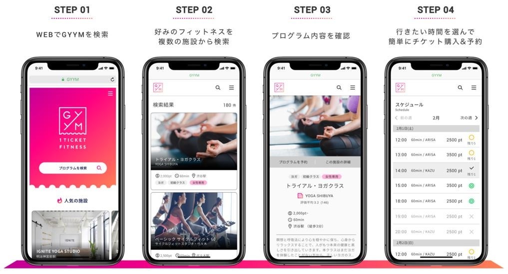 ・ ユーザーは、GYYMで「ジム等の検索」「予約」「決済」「都度利用」が可能。予約情報は、GYYMが予めジム等に共有するため、施設での入会手続き等は原則、一切不要。