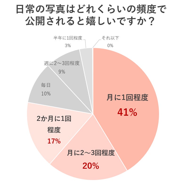 子どもの日常写真について好ましい公開頻度について尋ねたところ、「月に1回程度」(41%)が最も多く、続いて「月に2~3回程度」(20%)、「2か月に1回 程度」(17%)の結果になりました。