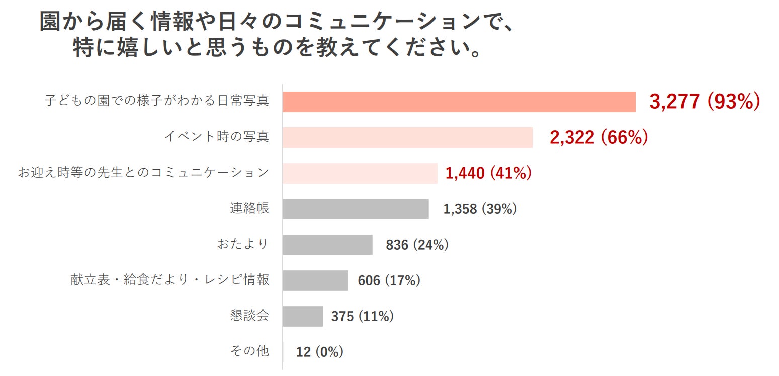 「園から届く情報や日々のコミュニケーションで特に嬉しいと思うもの」を尋ねたところ、「子どもの園での様子がわかる日常写真」(93%)、次いで「イベント時の写真」(66%)となりました。