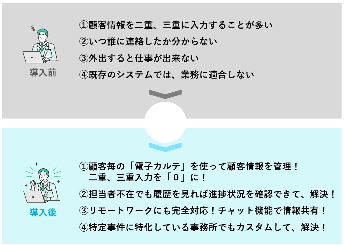 2.いつ誰に連絡したか所内で把握しにくい状況が、履歴を見れば進捗状況を確認できる為、担当者不在でも状況把握が容易にでき、顧客対応が可能になります。